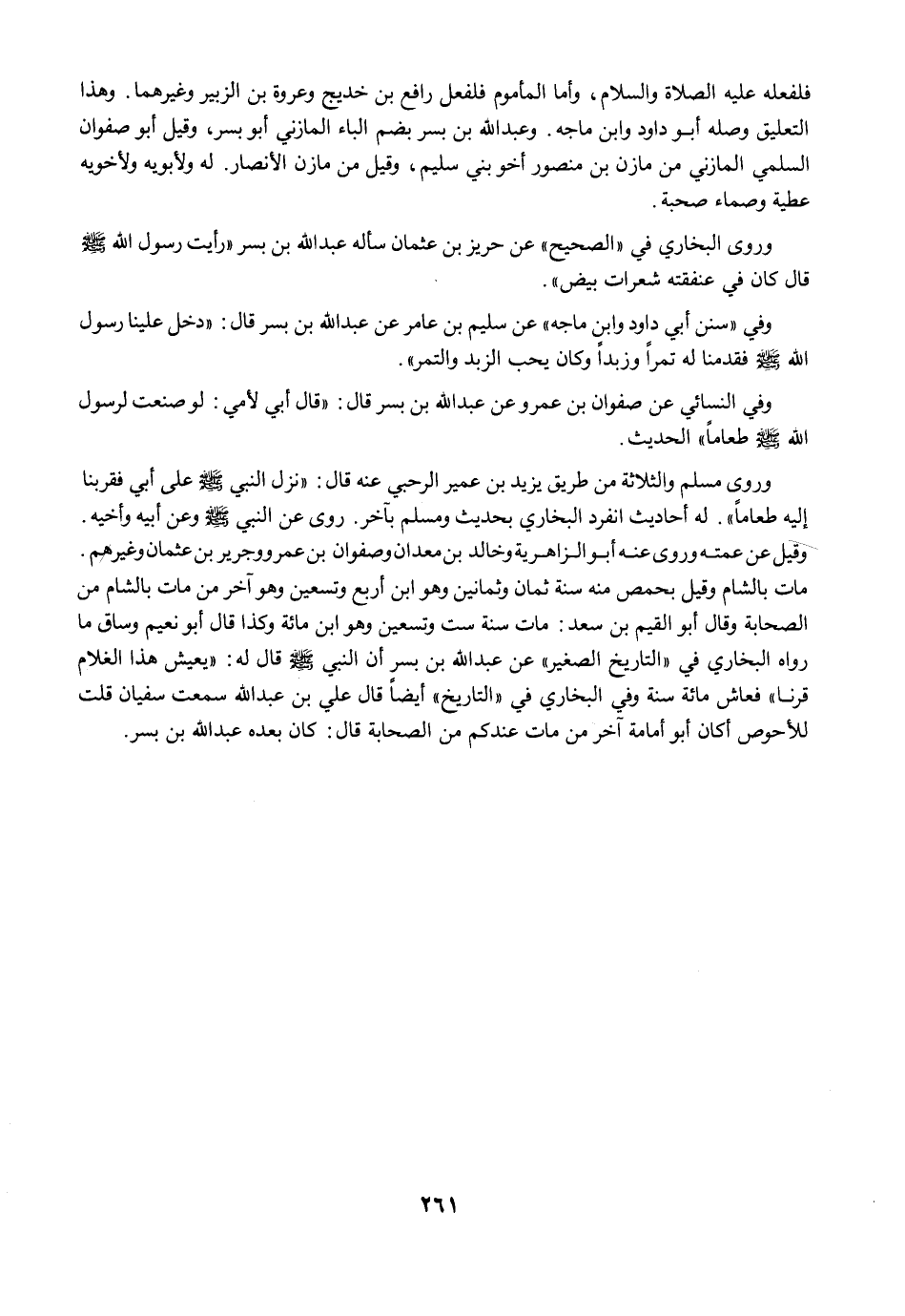 وروى مسلم والثلاثة من طريق يزيد بن عمير الرحبي عنه قال: "نزل النبي -صلى الله عليه وسلم- على أبي فقربنا إليه طعامًا". له أحاديث انفرد البخاري بحديث ومسلم بآخر. روى عن النبي -صلى الله عليه وسلم- وعن أبيه وأخيه. وقيل عن عمته وروى عنه أبو الزاهرية وخالد بن معدان وصفوان بن عمرو وجرير بن عثمان وغيرهم. مات بالشام وقيل بحمص منه سنة ثمان وثمانين وهو ابن أربع وتسعين وهو آخر من مات بالشام من الصحابة وقال أبو القيم بن سعد: مات سنة ست وتسعين وهو ابن مائة وكذا قال أبو نعيم وساق ما رواه البخاري في "التاريخ الصغير" عن عبد الله بن بسر أن النبي -صلى الله عليه وسلم- قال له: "يعيش هذا الغلام قرنا" فعاش مائة سنة وفي البخاري في "التاريخ" أيضًا قال علي بن عبد الله سمعت سفيان قلت للأحوص أكان أبو أمامة آخر من مات عندكم من الصحابة قال: كان بعده عبد الله بن بسر.