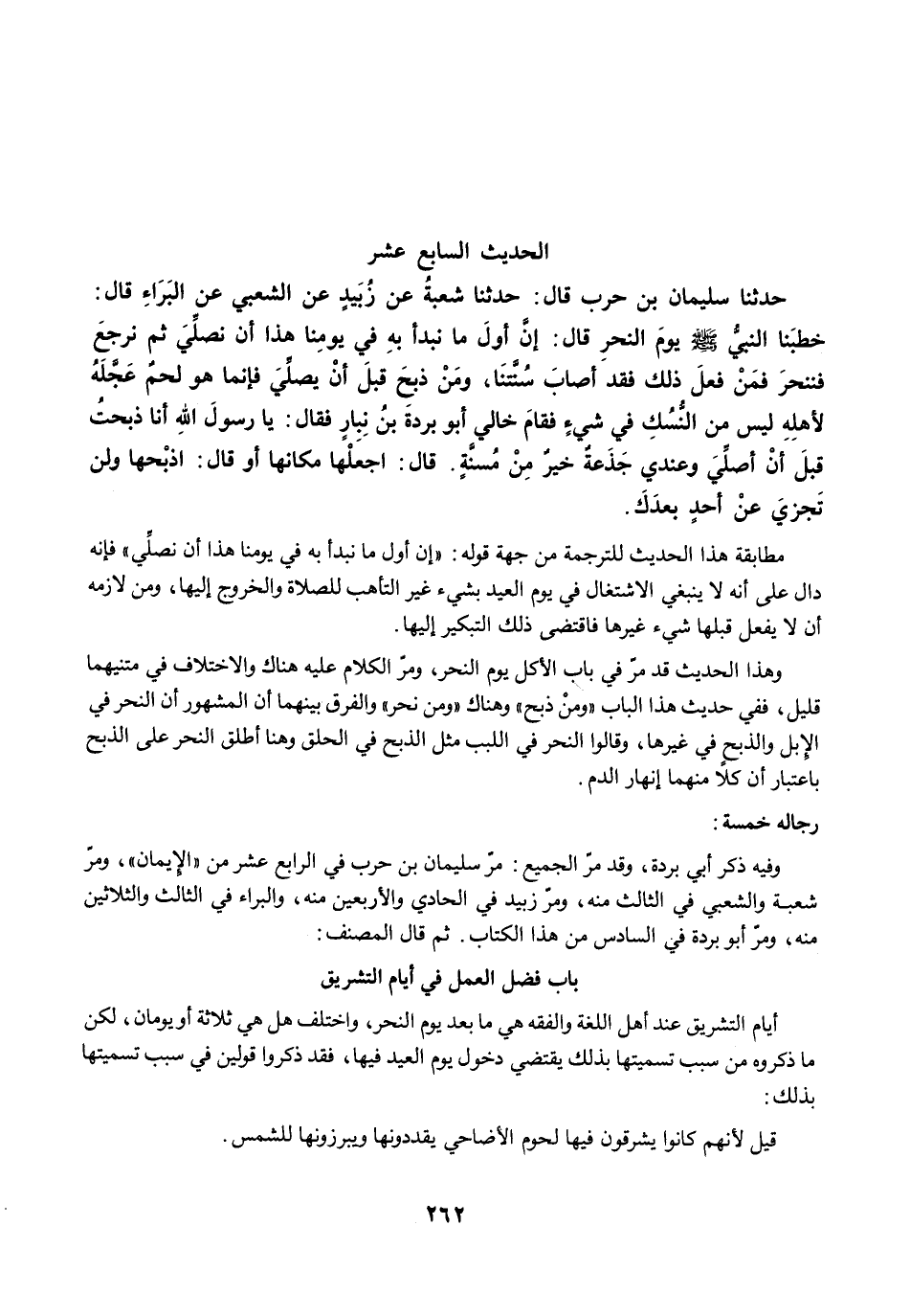 حَدَّثَنَا سُلَيْمَانُ بْنُ حَرْبٍ قَالَ: حَدَّثَنَا شُعْبَةُ عَنْ زُبَيْدٍ عَنِ الشَّعْبِيِّ عَنِ الْبَرَاءِ قَالَ: خَطَبَنَا النَّبِيُّ -صلى الله عليه وسلم- يَوْمَ النَّحْرِ قَالَ: إِنَّ أَوَّلَ مَا نَبْدَأُ بِهِ فِي يَوْمِنَا هَذَا أَنْ نُصَلِّيَ ثُمَّ نَرْجِعَ فَنَنْحَرَ، فَمَنْ فَعَلَ ذَلِكَ فَقَدْ أَصَابَ سُنَّتَنَا، وَمَنْ ذَبَحَ قَبْلَ أَنْ يُصَلِّيَ فَإِنَّمَا هُوَ لَحْمٌ عَجَّلَهُ لأَهْلِهِ، لَيْسَ مِنَ النُّسُكِ فِي شَيْءٍ. فَقَامَ خَالِي أَبُو بُرْدَةَ بْنُ نِيَارٍ فَقَالَ: يَا رَسُولَ اللَّهِ، أَنَا ذَبَحْتُ قَبْلَ أَنْ أُصَلِّيَ وَعِنْدِى جَذَعَةٌ خَيْرٌ مِنْ مُسِنَّةٍ. قَالَ: اجْعَلْهَا مَكَانَهَا أَوْ قَالَ: اذْبَحْهَا وَلَنْ تَجْزِيَ جَذَعَةٌ عَنْ أَحَدٍ بَعْدَكَ.