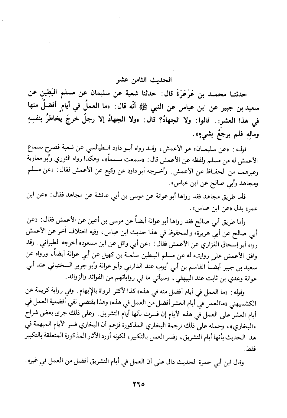 حَدَّثَنَا مُحَمَّدُ بْنُ عَرْعَرَةَ قَالَ: حَدَّثَنَا شُعْبَةُ عَنْ سُلَيْمَانَ عَنْ مُسْلِمٍ الْبَطِينِ عَنْ سَعِيدِ بْنِ جُبَيْرٍ عَنِ ابْنِ عَبَّاسٍ عَنِ النَّبِيِّ -صلى الله عليه وسلم- أَنَّهُ قَالَ: "مَا الْعَمَلُ فِي أَيَّامِ الْعَشْرِ أَفْضَلَ مِنَ الْعَمَلِ فِي هَذِهِ". قَالُوا: وَلاَ الْجِهَادُ؟ قَالَ: "وَلاَ الْجِهَادُ، إِلاَّ رَجُلٌ خَرَجَ يُخَاطِرُ بِنَفْسِهِ وَمَالِهِ فَلَمْ يَرْجِعْ بِشَيْءٍ".