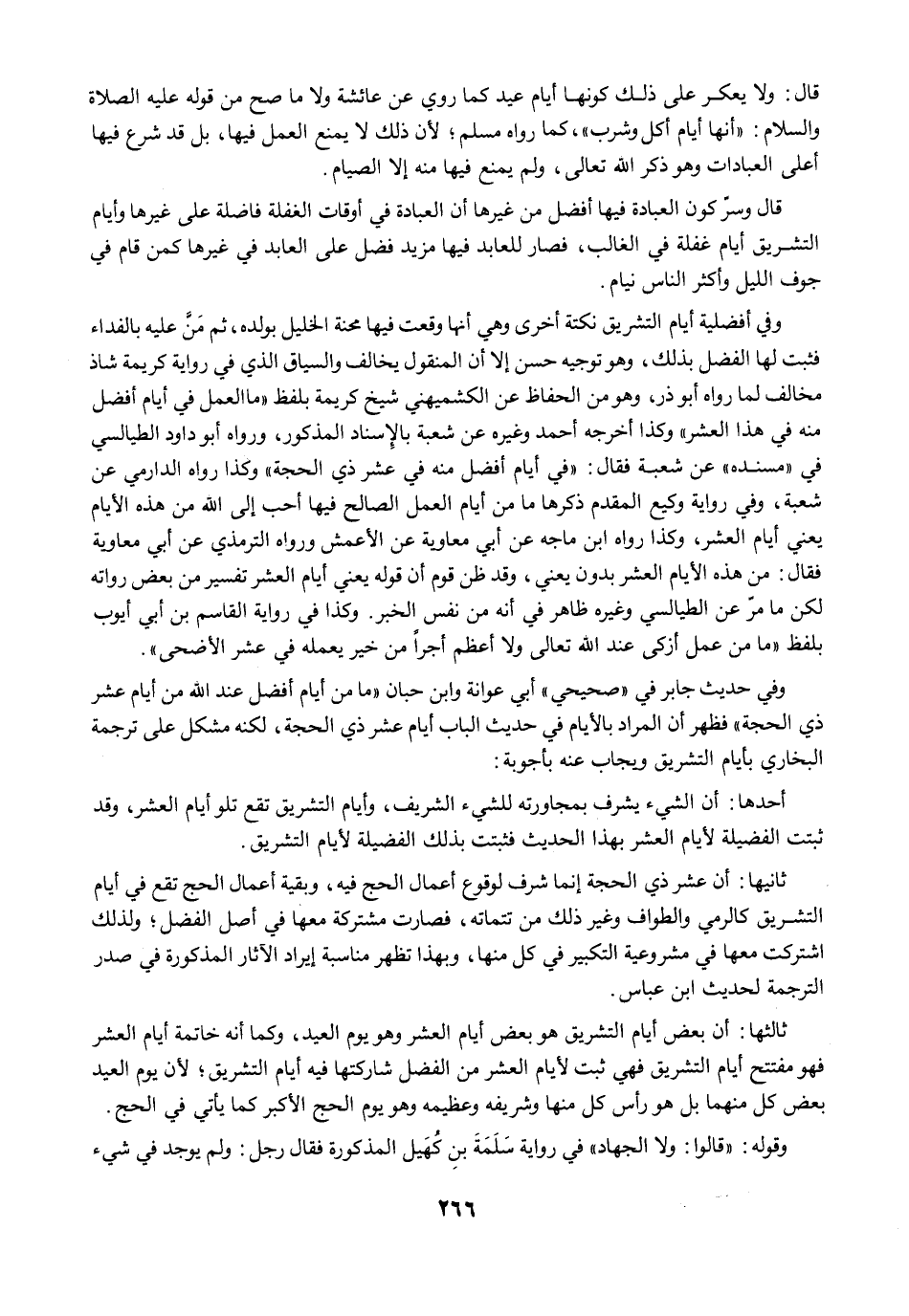 ثالثها: أن بعض أيام التشريق هو بعض أيام العشر وهو يوم العيد، وكما أنه خاتمة أيام العشر فهو مفتتح أيام التشريق فهي ثبت لأيام العشر من الفضل شاركتها فيه أيام التشريق؛ لأن يوم العيد بعض كل منهما بل هو رأس كل منها وشريفه وعظيمه وهو يوم الحج الأكبر كما يأتي في الحج.
