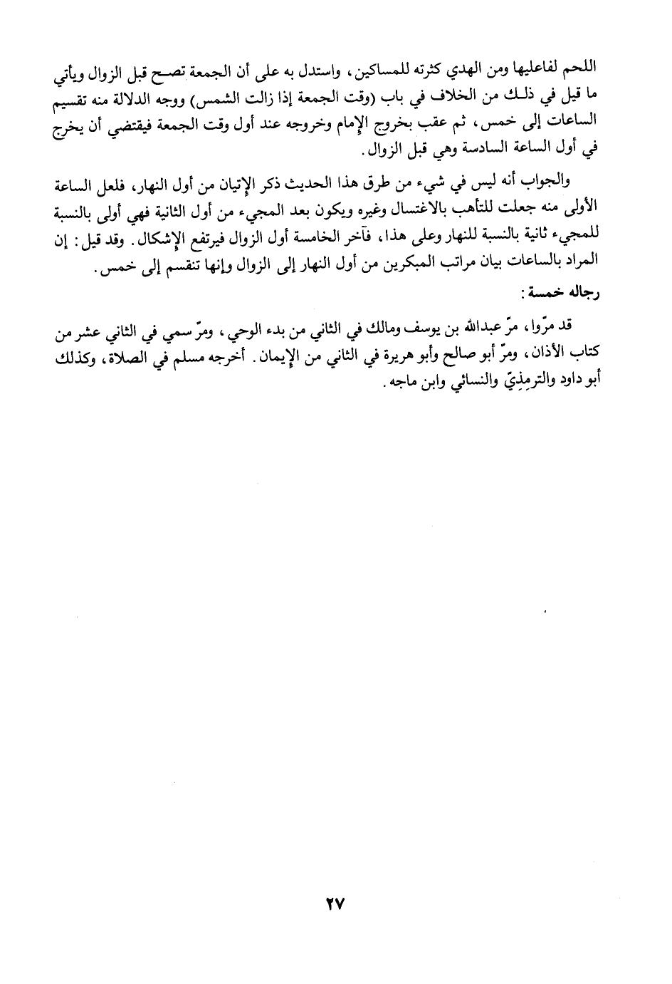 والجواب أنه ليس في شيء من طرق هذا الحديث ذكر الإتيان من أول النهار، فلعل الساعة الأولى منه جعلت للتأهب بالاغتسال وغيره ويكون بعد المجيء من أول الثانية فهي أولى بالنسبة للمجيء ثانية بالنسبة للنهار وعلى هذا، فآخر الخامسة أول الزوال فيرتفع الإشكال. وقد قيل: إن المراد بالساعات بيان مراتب المبكرين من أول النهار إلى الزوال وإنها تنقسم إلى خمس.