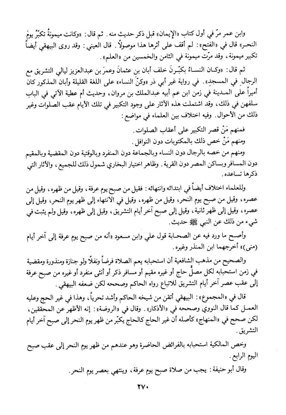 ثم قال: "وكان النساءُ يكبّرنَ خلف أبان بن عثمانَ وعمرَ بن عبد العزيز ليالي التشريق مع الرجالِ في المسجدِ". في رواية غير أبي ذر "وكنّ النساء" على اللغة القليلة وأبان المذكور كان أميرًا على المدينة في زمن ابن عم أبيه عبد الملك بن مروان، وحديث أم عطية الآتي في الباب سلفهن في ذلك، وقد اشتملت هذه الآثار على وجود التكبير في تلك الأيام عقب الصلوات وغير ذلك من الأحوال. وفيه اختلاف بين العلماء في مواضع: