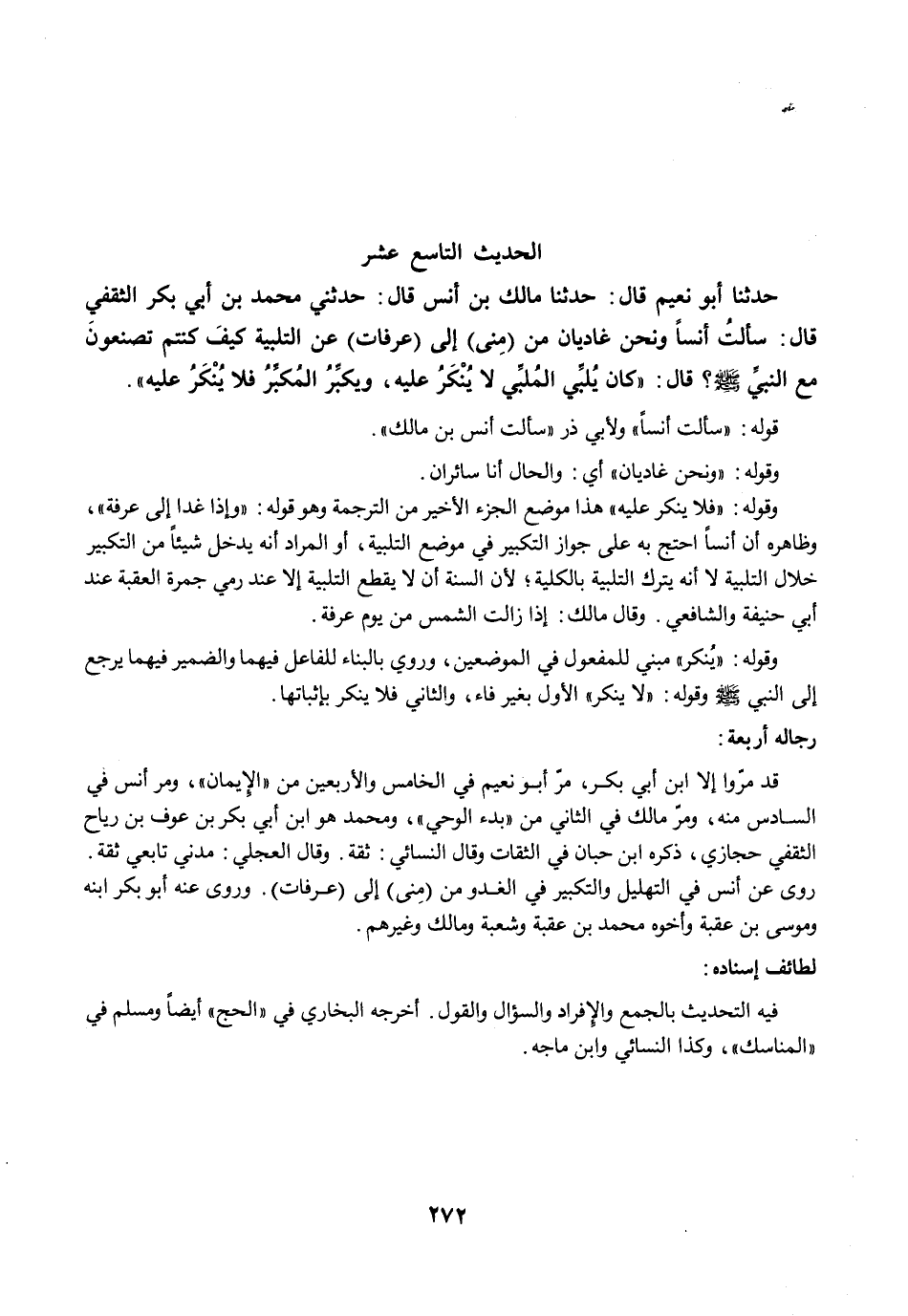 حَدَّثَنَا أَبُو نُعَيْمٍ قَالَ: حَدَّثَنَا مَالِكُ بْنُ أَنَسٍ قَالَ: حَدَّثَنِي مُحَمَّدُ بْنُ أَبِي بَكْرٍ الثَّقَفِيُّ قَالَ: سَأَلْتُ أَنَسًا وَنَحْنُ غَادِيَانِ مِنْ (مِنًى) إِلَى (عَرَفَاتٍ) عَنِ التَّلْبِيَةِ كَيْفَ كُنْتُمْ تَصْنَعُونَ مَعَ النَّبِيِّ -صلى الله عليه وسلم-؟ قَالَ: "كَانَ يُلَبِّي الْمُلَبِّي لاَ يُنْكَرُ عَلَيْهِ، وَيُكَبِّرُ الْمُكَبِّرُ فَلاَ يُنْكَرُ عَلَيْهِ".