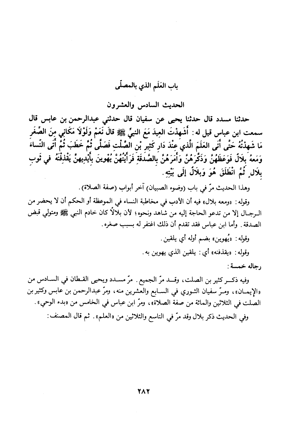 حَدَّثَنَا مُسَدَّدٌ قَالَ حَدَّثَنَا يَحْيَى عَنْ سُفْيَانَ قَالَ حَدَّثَنِي عَبْدُ الرَّحْمَنِ بْنُ عَابِسٍ قَالَ سَمِعْتُ ابْنَ عَبَّاسٍ قِيلَ لَهُ: أَشَهِدْتَ الْعِيدَ مَعَ النَّبِيِّ -صلى الله عليه وسلم- قَالَ نَعَمْ، وَلَوْلاَ مَكَانِي مِنَ الصِّغَرِ مَا شَهِدْتُهُ، حَتَّى أَتَى الْعَلَمَ الَّذِي عِنْدَ دَارِ كَثِيرِ بْنِ الصَّلْتِ فَصَلَّى ثُمَّ خَطَبَ ثُمَّ أَتَى النِّسَاءَ، وَمَعَهُ بِلاَلٌ، فَوَعَظَهُنَّ وَذَكَّرَهُنَّ، وَأَمَرَهُنَّ بِالصَّدَقَةِ، فَرَأَيْتُهُنَّ يُهْوِينَ بِأَيْدِيهِنَّ يَقْذِفْنَهُ فِي ثَوْبِ بِلاَلٍ، ثُمَّ انْطَلَقَ هُوَ وَبِلاَلٌ إِلَى بَيْتِهِ.