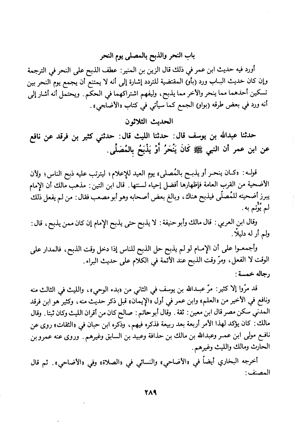 حَدَّثَنَا عَبْدُ اللَّهِ بْنُ يُوسُفَ قَالَ: حَدَّثَنَا اللَّيْثُ قَالَ: حَدَّثَنِي كَثِيرُ بْنُ فَرْقَدٍ عَنْ نَافِعٍ عَنِ ابْنِ عُمَرَ أَنَّ النَّبِيَّ -صلى الله عليه وسلم- كَانَ يَنْحَرُ أَوْ يَذْبَحُ بِالْمُصَلَّى.