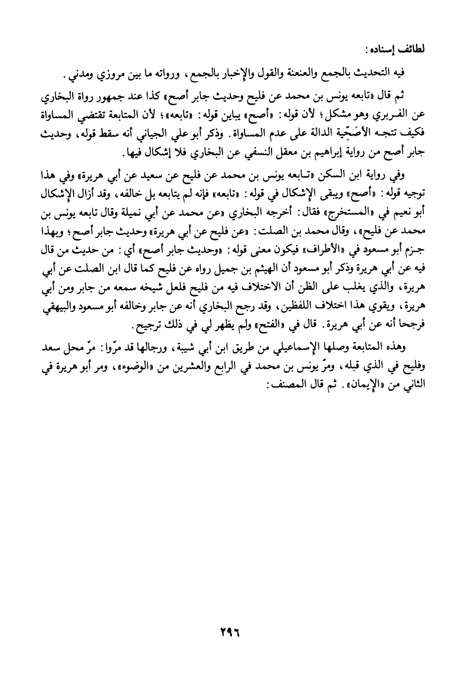 وفي رواية ابن السكن "تابعه يونس بن محمد عن فليح عن سعيد عن أبي هريرة" وفي هذا توجيه قوله: "أصح" ويبقى الإشكال في قوله: "تابعه" فإنه لم يتابعه بل خالفه، وقد أزال الإشكال أبو نعيم في "المستخرج" فقال: أخرجه البخاري "عن محمد عن أبي نميلة وقال تابعه يونس بن محمد عن فليح"، وقال محمد بن الصلت: "عن فليح عن أبي هريرة" وحديث جابر أصح؛ وبهذا جزم أبو مسعود في "الأطراف" فيكون معنى قوله: "وحديث جابر أصح" أي: من حديث من قال فيه عن أبي هريرة وذكر أبو مسعود أن الهيثم بن جميل رواه عن فليح كما قال ابن الصلت عن أبي هريرة، والذي يغلب على الظن أن الاختلاف فيه من فليح فلعل شيخه سمعه من جابر ومن أبي هريرة، ويقوي هذا اختلاف اللفظين، وقد رجح البخاري أنه عن جابر وخالفه أبو مسعود والبيهقي فرجحا أنه عن أبي هريرة. قال في "الفتح" ولم يظهر لي في ذلك ترجيح.