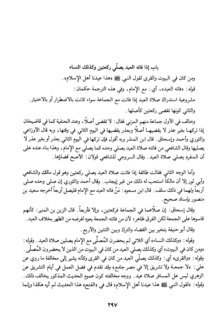 وقال إسحاق: إن صلاّهما في الجماعة فركعتين، وإلا فأربعًا. قال الزين بن المنير: كأنهم قاسوها على الجمعة لكن الفرق ظاهر؛ لأن من فاتته الجمعة يعود لفرضه من الظهر بخلاف العيد.