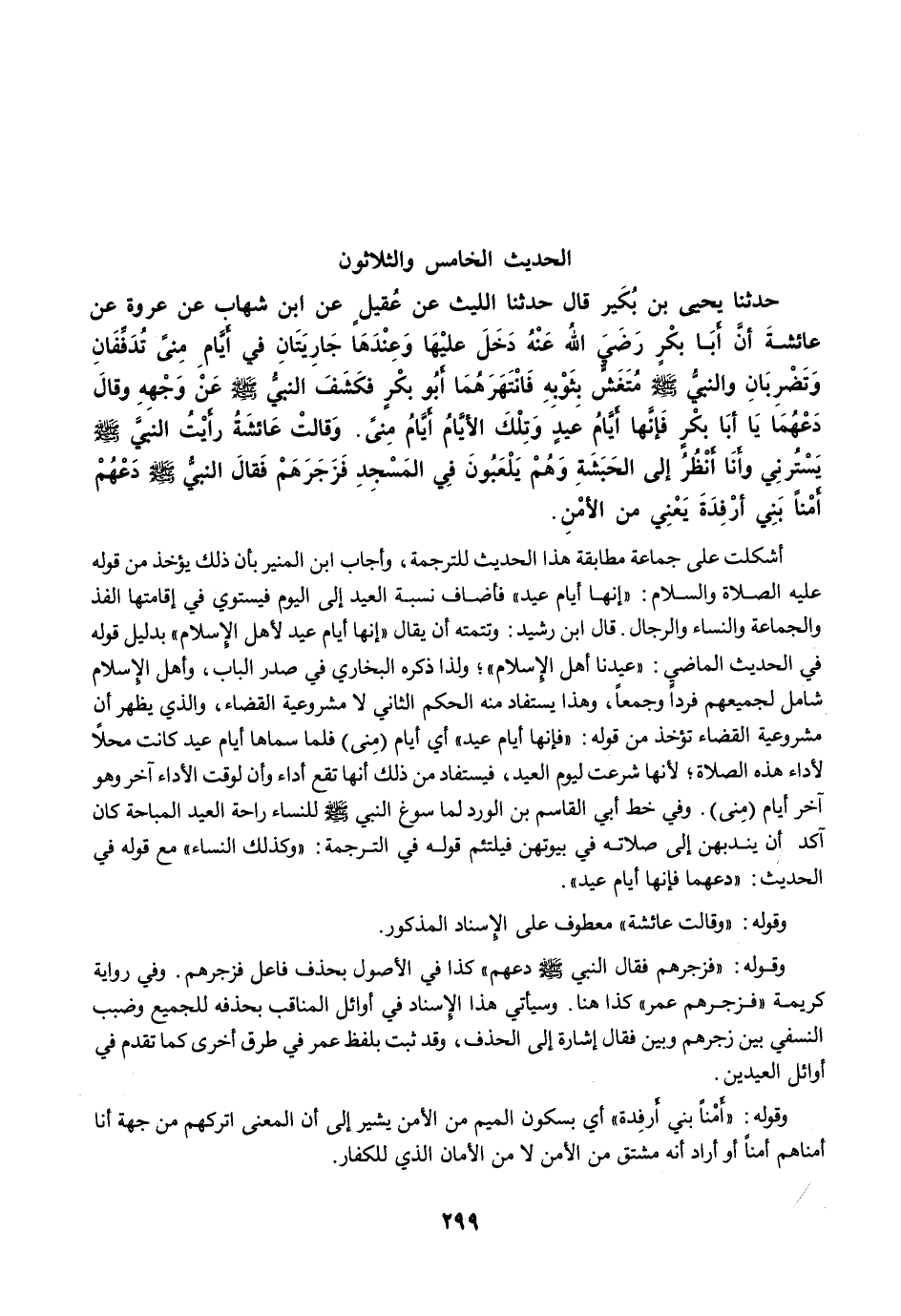 حَدَّثَنَا يَحْيَى بْنُ بُكَيْرٍ قَالَ حَدَّثَنَا اللَّيْثُ عَنْ عُقَيْلٍ عَنِ ابْنِ شِهَابٍ عَنْ عُرْوَةَ عَنْ عَائِشَةَ أَنَّ أَبَا بَكْرٍ رضي الله عنه دَخَلَ عَلَيْهَا وَعِنْدَهَا جَارِيَتَانِ فِي أَيَّامِ مِنًى تُدَفِّفَانِ وَتَضْرِبَانِ، وَالنَّبِىُّ -صلى الله عليه وسلم- مُتَغَشٍّ بِثَوْبِهِ، فَانْتَهَرَهُمَا أَبُو بَكْرٍ فَكَشَفَ النَّبِيُّ -صلى الله عليه وسلم- عَنْ وَجْهِهِ وَقَالَ دَعْهُمَا يَا أَبَا بَكْرٍ فَإِنَّهَا أَيَّامُ عِيدٍ. وَتِلْكَ الأَيَّامُ أَيَّامُ مِنًى. وَقَالَتْ عَائِشَةُ رَأَيْتُ النَّبِيَّ -صلى الله عليه وسلم- يَسْتُرُنِي، وَأَنَا أَنْظُرُ إِلَى الْحَبَشَةِ وَهُمْ يَلْعَبُونَ فِي الْمَسْجِدِ، فَزَجَرَهُمْ عُمَرُ فَقَالَ النَّبِيُّ -صلى الله عليه وسلم- دَعْهُمْ، أَمْنًا بَنِي أَرْفِدَةَ. يَعْنِي مِنَ الأَمْنِ.