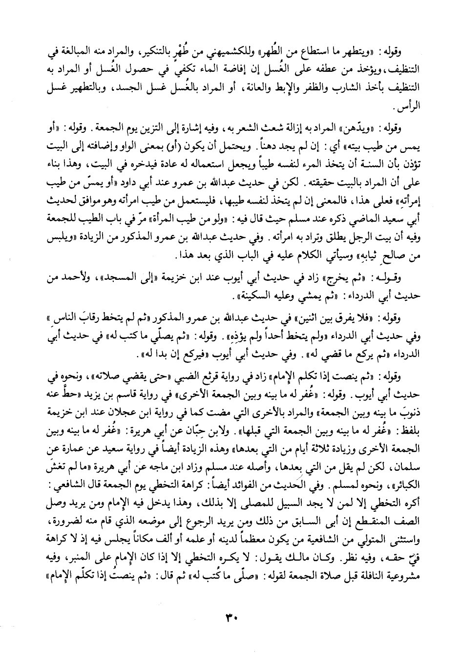 وقوله: "ثم ينصت إذا تكلم الإِمام" زاد في رواية قرثع الضبي "حتى يقضي صلاته"، ونحوه في حديث أبي أيوب. وقوله: "غُفر له ما بينه وبين الجمعة الأخرى" في رواية قاسم بن يزيد "حطَّ عنه ذنوبَ ما بينه وبين الجمعة" والمراد بالأخرى التي مضت كما في رواية ابن عجلان عند ابن خزيمة بلفظ: "غُفر له ما بينه وبين الجمعة التي قبلها". ولابن حِبّان عن أبي هريرة: "غُفر له ما بينه وبين الجمعة الأخرى وزيادة ثلاثة أيام من التي بعدها" وهذه الزيادة أيضًا في رواية سعيد عن عمارة عن سلمان، لكن لم يقل من التي بعدها، وأصله عند مسلم وزاد ابن ماجه عن أبي هريرة "ما لم تغش الكبائر"، ونحوه لمسلم. وفي الحديث من الفوائد أيضًا: كراهة التخطي يوم الجمعة قال الشافعي: أكره التخطي إلا لمن لا يجد السبيل للمصلى إلا بذلك، وهذا يدخل فيه الإمام ومن يريد وصل الصف المنقطع إن أبى السابق من ذلك ومن يريد الرجوع إلى موضعه الذي قام عنه لضرورة، واستثنى المتولي من الشافعية من يكون معظمًا لدينه أو علمه أو ألف مكانًا يجلس فيه إذ لا كراهة في حقه، وفيه نظر. وكان مالك يقول: لا يكره التخطي إلا إذا كان الإمام على المنبر، وفيه مشروعية النافلة قبل صلاة الجمعة لقوله: "صلّى ما كُتب له" ثم قال: "ثم ينصت إذا تكلّم الإمام"