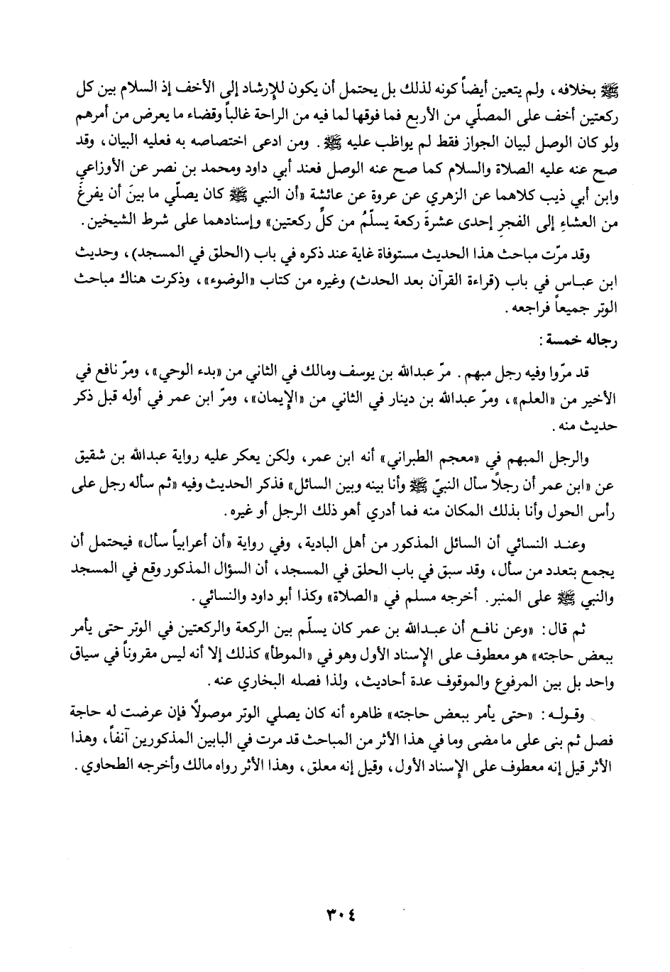 ثم قال: "وعن نافع أن عبد الله بن عمر كان يسلّم بين الركعة والركعتين في الوتر حتى يأمر ببعض حاجته" هو معطوف على الإِسناد الأول وهو في "الموطأ" كذلك إلا أنه ليس مقرونًا في سياق واحد بل بين المرفوع والموقوف عدة أحاديث، ولذا فصله البخاري عنه.