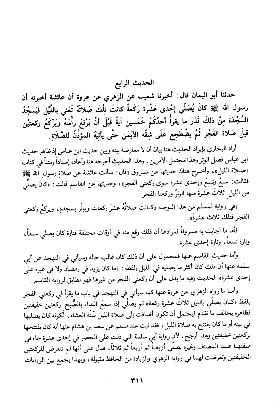 وأما مارواه الزهري عن عروة عنها كما سيأتي في التهجد في باب ما يقرأ في ركعتي الفجر بلفظ "كان يصلي بالليل ثلاثَ عشرةَ ركعة" ثم يصلي إذا سمعَ النداء بالصُّبحِ ركعتين خفيفتين فظاهره يخالف ما تقدم فيحتمل أن تكون أضافت إلى صلاة الليل سُنّة العشاء، لكونه كان يصليها في بيته أو ما كان يفتتح به صلاة الليل، فقد ثبت عند مسلم عن سعد بن هشام عنها أنه كان يفتتحها بركعتين خفيفتين وهذا أرجح؛ لأن رواية أبي سلمة التي دلت على الحصر في إحدى عشرة جاء في صفتها عند المصنف وغيره يصلي أربعًا ثم أربعًا ثم ثلاثًا، فدل على أنها لم تتعرض للركعتين الخفيفتين وتعرضت لهما في رواية الزهري والزيادة من الحافظ مقبولة، وبهذا يجمع بين الروايات