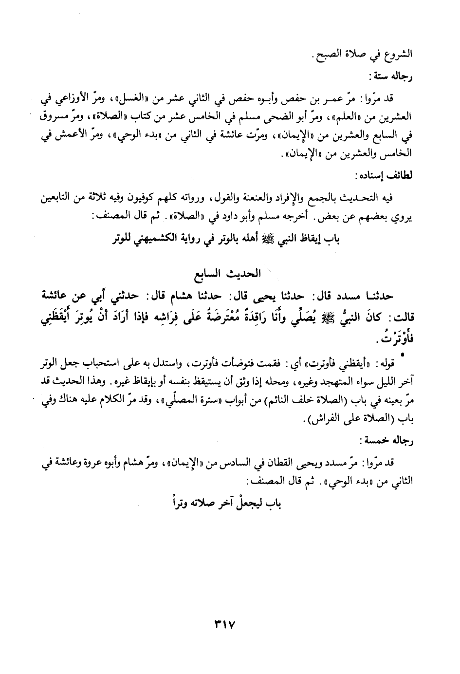 حَدَّثَنَا مُسَدَّدٌ قَالَ: حَدَّثَنَا يَحْيَى قَالَ: حَدَّثَنَا هِشَامٌ قَالَ: حَدَّثَنِي أَبِي عَنْ عَائِشَةَ قَالَتْ: كَانَ النَّبِيُّ -صلى الله عليه وسلم- يُصَلِّي، وَأَنَا رَاقِدَةٌ مُعْتَرِضَةً عَلَى فِرَاشِهِ، فَإِذَا أَرَادَ أَنْ يُوتِرَ أَيْقَظَنِي فَأَوْتَرْتُ.