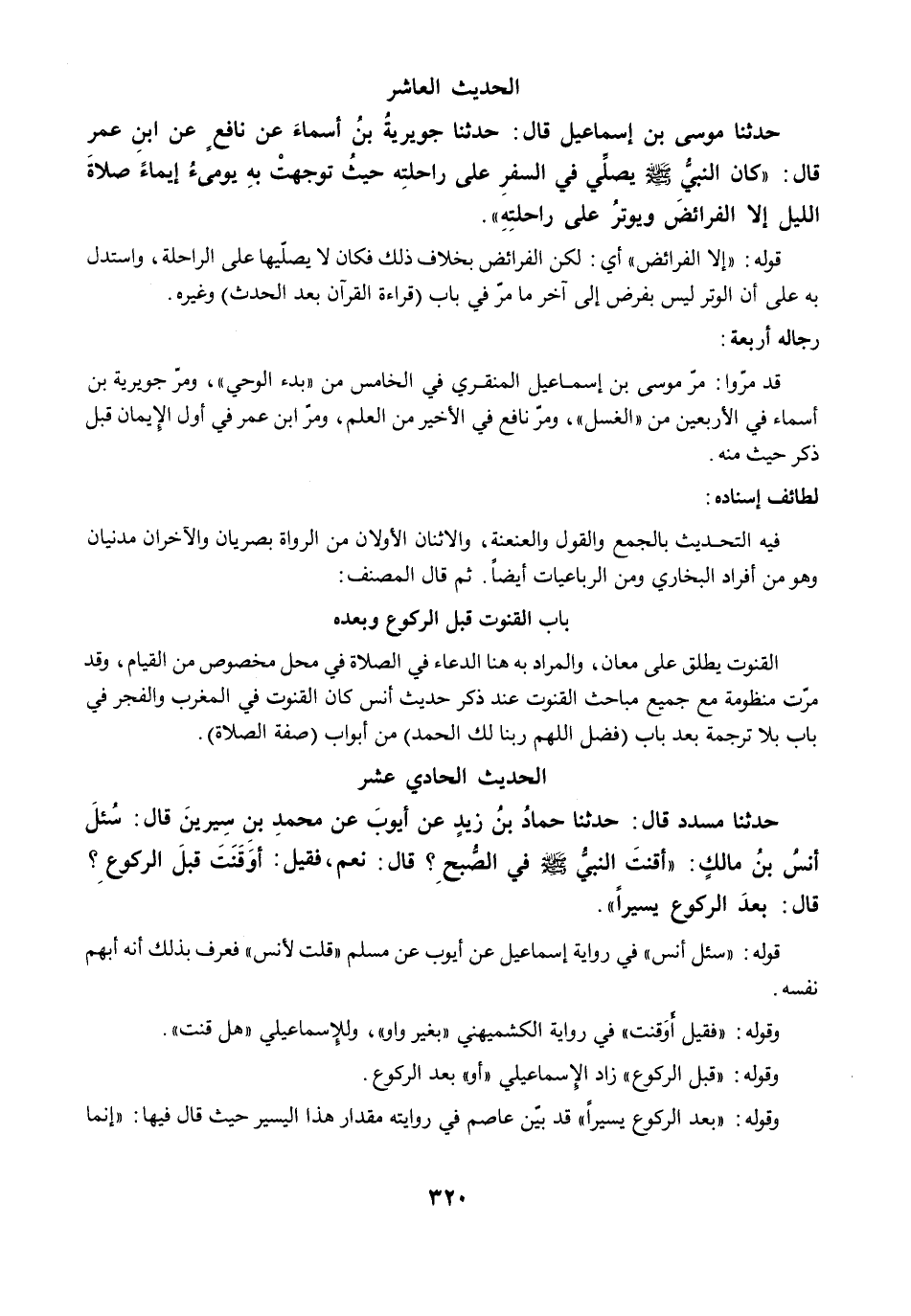 حَدَّثَنَا مُسَدَّدٌ قَالَ: حَدَّثَنَا حَمَّادُ بْنُ زَيْدٍ عَنْ أَيُّوبَ عَنْ مُحَمَّدٍ بن سيرين قَالَ: سُئِلَ أَنَسٌ بن مالكٍ: "أَقَنَتَ النَّبِيُّ -صلى الله عليه وسلم- فِي الصُّبْحِ؟ قَالَ: نَعَمْ. فَقِيلَ: أَوَقَنَتَ قَبْلَ الرُّكُوعِ؟ قَالَ: بَعْدَ الرُّكُوعِ يَسِيرًا".