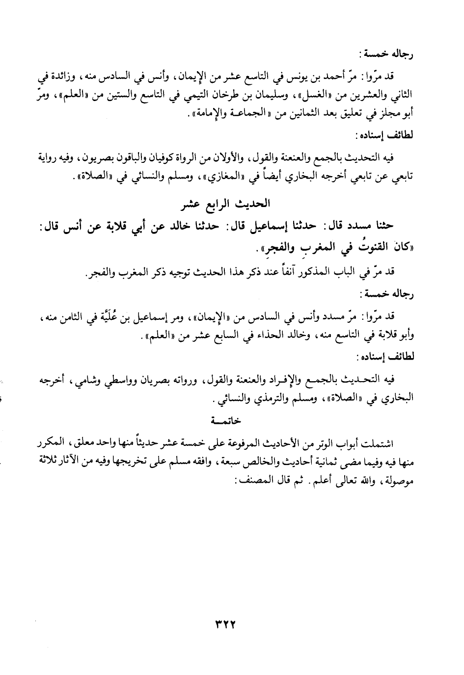 قد مرّوا: مرّ مسدد وأنس في السادس من "الإيمان"، ومرّ إسماعيل بن عُلَيَّة في الثامن منه، وأبو قلابة في التاسع منه، وخالد الحذاء في السابع عشر من "العلم".