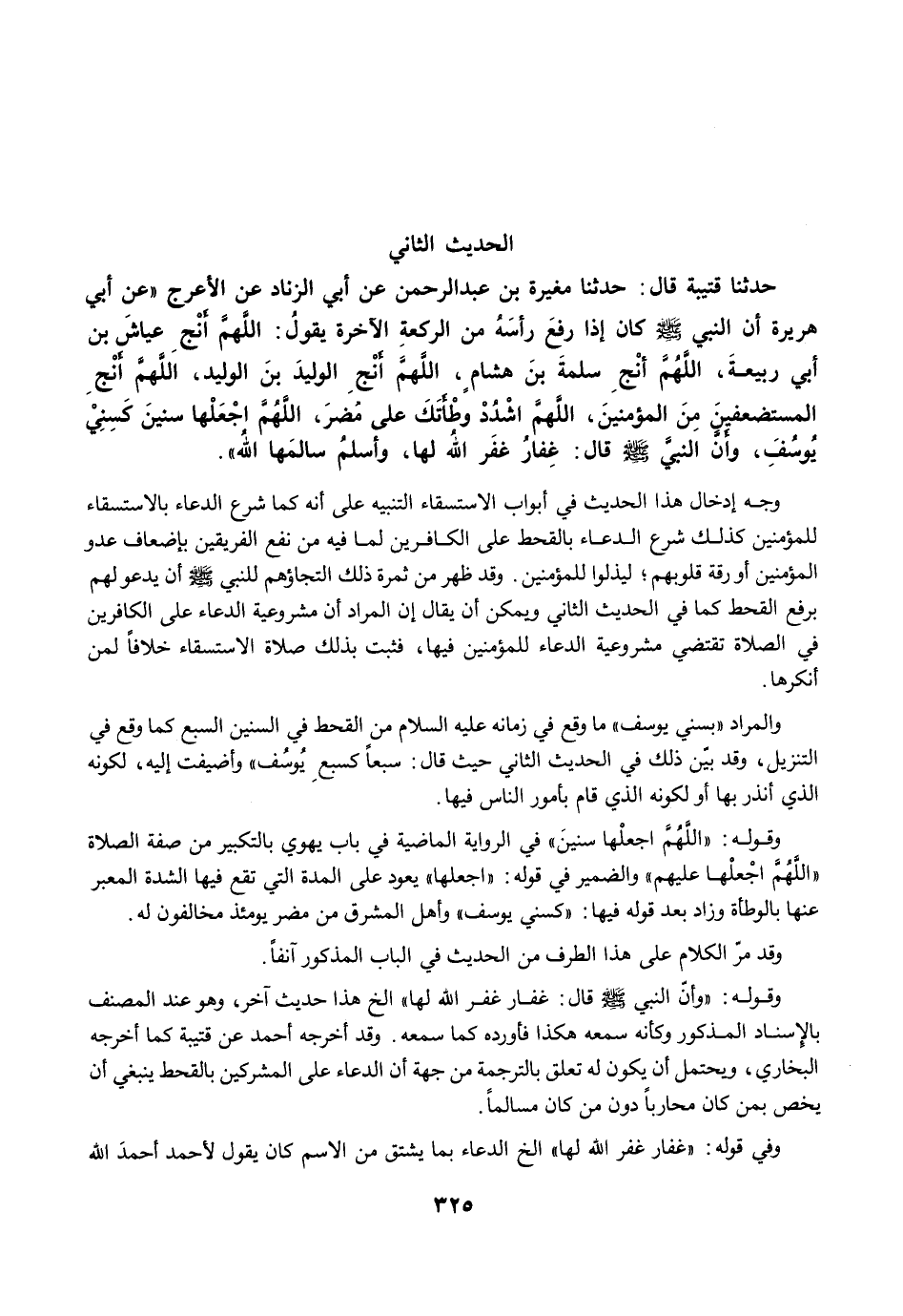 حَدَّثَنَا قُتَيْبَةُ قال: حَدَّثَنَا مُغِيرَةُ بْنُ عَبْدِ الرَّحْمَنِ عَنْ أَبِي الزِّنَادِ عَنِ الأَعْرَجِ "عَنْ أَبِي هُرَيْرَةَ أَنَّ النَّبِيَّ -صلى الله عليه وسلم- كَانَ إِذَا رَفَعَ رَأْسَهُ مِنَ الرَّكْعَةِ الآخِرَةِ يَقُولُ: اللَّهُمَّ أَنْجِ عَيَّاشَ بْنَ أَبِي رَبِيعَةَ، اللَّهُمَّ أَنْجِ سَلَمَةَ بْنَ هِشَامٍ، اللَّهُمَّ أَنْجِ الْوَلِيدَ بْنَ الْوَلِيدِ، اللَّهُمَّ أَنْجِ الْمُسْتَضْعَفِينَ مِنَ الْمُؤْمِنِينَ، اللَّهُمَّ اشْدُدْ وَطْأَتَكَ عَلَى مُضَرَ، اللَّهُمَّ اجْعَلْهَا سِنِينَ كَسِنِي يُوسُفَ. وَأَنَّ النَّبِيَّ -صلى الله عليه وسلم- قَالَ: غِفَارُ غَفَرَ اللَّهُ لَهَا، وَأَسْلَمُ سَالَمَهَا اللَّهُ".