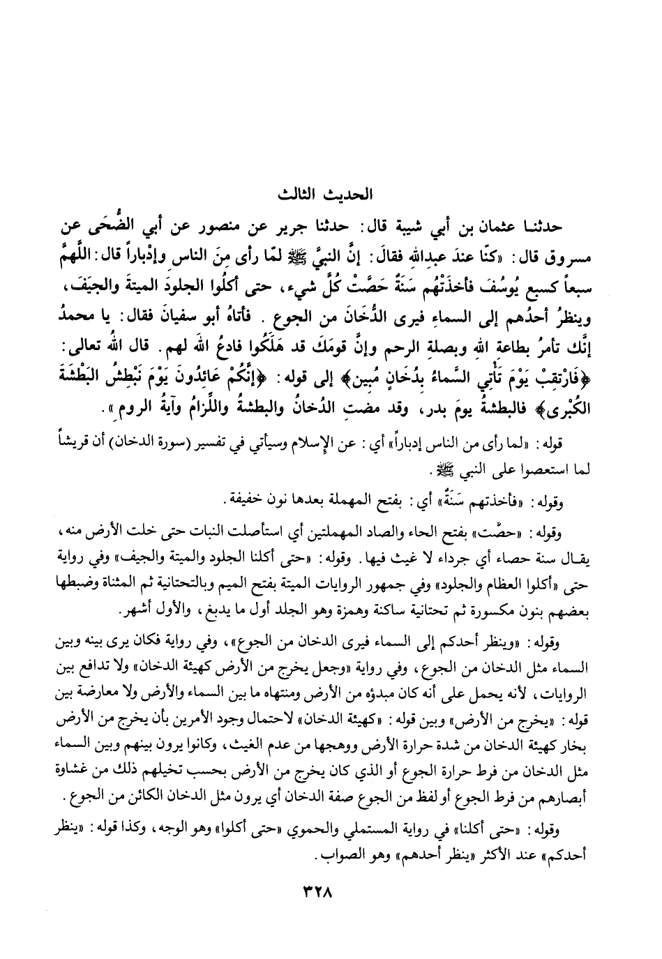 حَدَّثَنَا عُثْمَانُ بْنُ أَبِي شَيْبَةَ قَالَ: حَدَّثَنَا جَرِيرٌ عَنْ مَنْصُورٍ عَنْ أَبِي الضُّحَى عَنْ مَسْرُوقٍ قَالَ: "كُنَّا عِنْدَ عَبْدِ اللَّهِ فَقَالَ: إِنَّ النَّبِيَّ -صلى الله عليه وسلم- لَمَّا رَأَى مِنَ النَّاسِ إِدْبَارًا قَالَ: اللَّهُمَّ سَبْعٌ كَسَبْعِ يُوسُفَ. فَأَخَذَتْهُمْ سَنَةٌ حَصَّتْ كُلَّ شَيْءٍ حَتَّى أَكَلُوا الْجُلُودَ وَالْمَيْتَةَ وَالْجِيَفَ، وَيَنْظُرَ أَحَدُهُمْ إِلَى السَّمَاءِ فَيَرَى الدُّخَانَ مِنَ الْجُوعِ، فَأَتَاهُ أَبُو سُفْيَانَ فَقَالَ: يَا مُحَمَّدُ إِنَّكَ تَأْمُرُ بِطَاعَةِ اللَّهِ وَبِصِلَةِ الرَّحِمِ وَإِنَّ قَوْمَكَ قَدْ هَلَكُوا، فَادْعُ اللَّهَ لَهُمْ قَالَ اللَّهُ تَعَالَى: {فَارْتَقِبْ يَوْمَ تَأْتِي السَّمَاءُ بِدُخَانٍ مُبِينٍ} إِلَى قَوْلِهِ {إِنَّكُمْ عَائِدُونَ (15) يَوْمَ نَبْطِشُ الْبَطْشَةَ الْكُبْرَى} فَالْبَطْشَةُ يَوْمَ بَدْرٍ، وَقَدْ مَضَتِ الدُّخَانُ وَالْبَطْشَةُ وَاللِّزَامُ وَآيَةُ الرُّومِ".