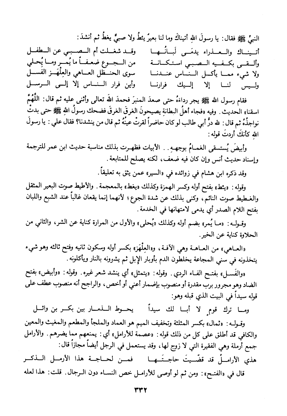 النبيِّ -صلى الله عليه وسلم- فقال: يا رسولَ اللهِ أتيناكَ وما لنا بعيرٌ يئطُ ولا صبي يغطُ ثم أنشدَ: