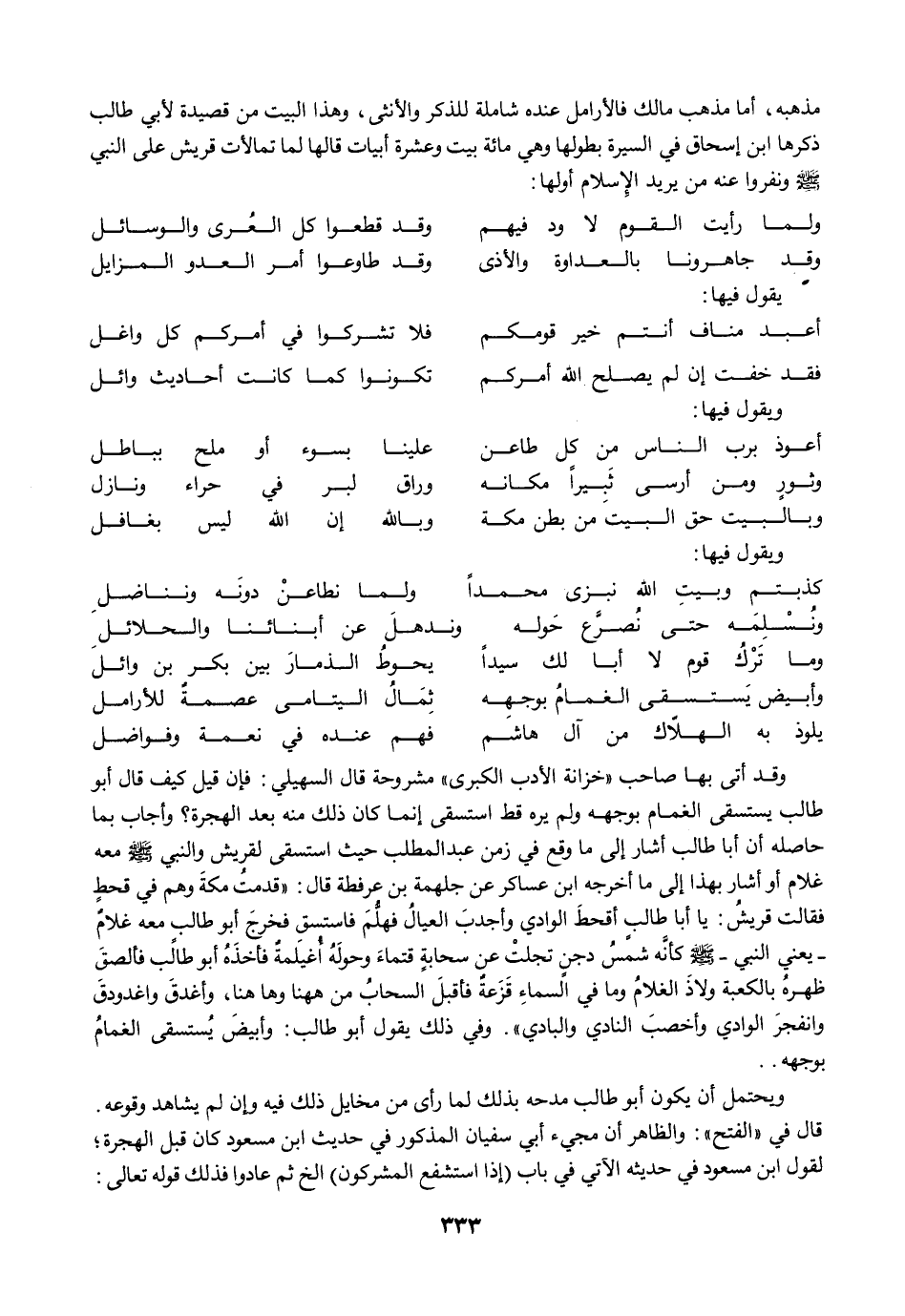وقد أتى بها صاحب "خزانة الأدب الكبرى" مشروحة قال السهيلي: فإن قيل كيف قال أبو طالب يستسقى الغمام بوجهه ولم يره قط استسقى إنما كان ذلك منه بعد الهجرة؟ وأجاب بما حاصله أن أبا طالب أشار إلى ما وقع في زمن عبد المطلب حيث استسقى لقريش والنبي -صلى الله عليه وسلم- معه غلام أو أشار بهذا إلى ما أخرجه ابن عساكر عن جلهمة بن عرفطة قال: "قدمتُ مكةَ وهم في قحطٍ فقالت قريشُ: يا أبا طالبٍ أقحطَ الوادي وأجدبَ العيالُ فهلُّمَ فاستسق فخرجَ أبو طالب معه غلامٌ -يعني النبي -صلى الله عليه وسلم- كأنَّه شمسُ دجنٍ تجلتْ في سحابةٍ قتماءَ وحولَهُ أغيَلمةٌ فأخذَهُ أبو طالب فألصقَ ظهرهُ بالكعبة ولاذَ الغلامُ وما في السماءِ قَزَعة فأقبلَ السحابُ من هاهنا وهاهنا، وأغدقَ واغدودقَ وانفجرَ الوادي وأخصبَ النادي والبادي". وفي ذلك يقول أبو طالب: وأبيضَ يُستسقى الغمامُ بوجهه ..