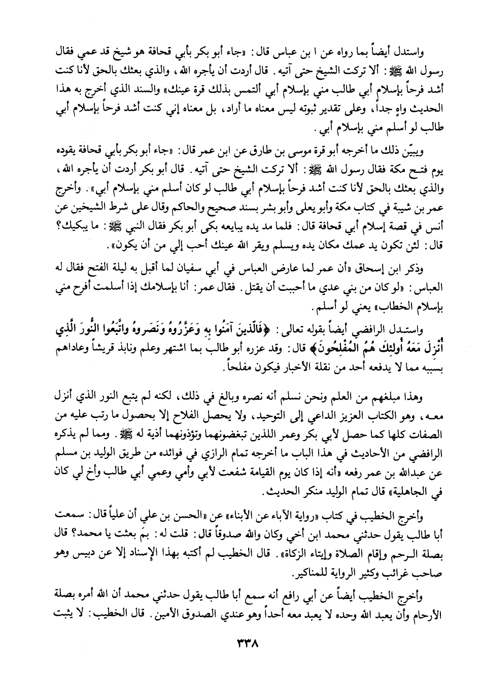 واستدل أيضًا بما رواه عن ابن عباس قال: "جاء أبو بكر بأبي قحافة هو شيخ قد عمي فقال رسول الله -صلى الله عليه وسلم-: ألا تركت الشيخ حتى آتيه. قال أردت أن يأجره الله، والذي بعثك بالحق لأنا كنت أشد فرحًا بإسلام أبي طالب مني بإسلام أبي ألتمس بذلك قرة عينك" والسند الذي أخرج به هذا الحديث واهٍ جدًا، وعلى تقدير ثبوته ليس معناه ما أراد، بل معناه إني كنت أشد فرحًا بإسلام أبي طالب لو أسلم مني بإسلام أبي.