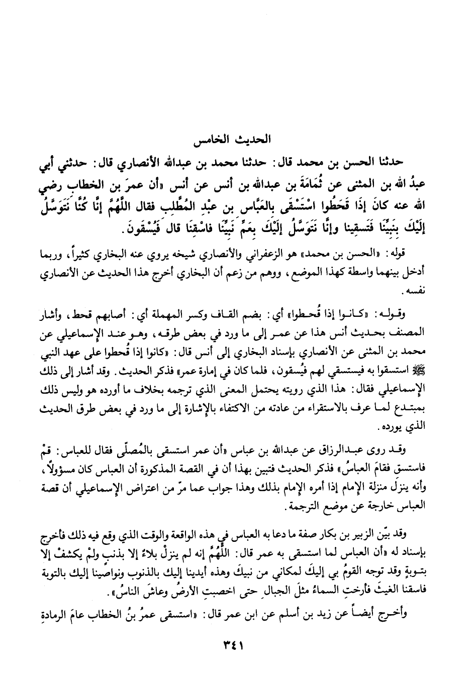 حَدَّثَنَا الْحَسَنُ بْنُ مُحَمَّدٍ قَالَ: حَدَّثَنَا مُحَمَّدُ بْنُ عَبْدِ اللَّهِ الأَنْصَارِيُّ قَالَ: حَدَّثَنِي أَبِي عَبْدُ اللَّهِ بْنُ الْمُثَنَّى عَنْ ثُمَامَةَ بْنِ عَبْدِ اللَّهِ بْنِ أَنَسٍ عَنْ أَنَسٍ "أَنَّ عُمَرَ بْنَ الْخَطَّابِ رضي الله عنه كَانَ إِذَا قَحَطُوا اسْتَسْقَى بِالْعَبَّاسِ بْنِ عَبْدِ الْمُطَّلِبِ فَقَالَ اللَّهُمَّ إِنَّا كُنَّا نَتَوَسَّلُ إِلَيْكَ بِنَبِيِّنَا فَتَسْقِينَا وَإِنَّا نَتَوَسَّلُ إِلَيْكَ بِعَمِّ نَبِيِّنَا فَاسْقِنَا. قَالَ فَيُسْقَوْنَ.
