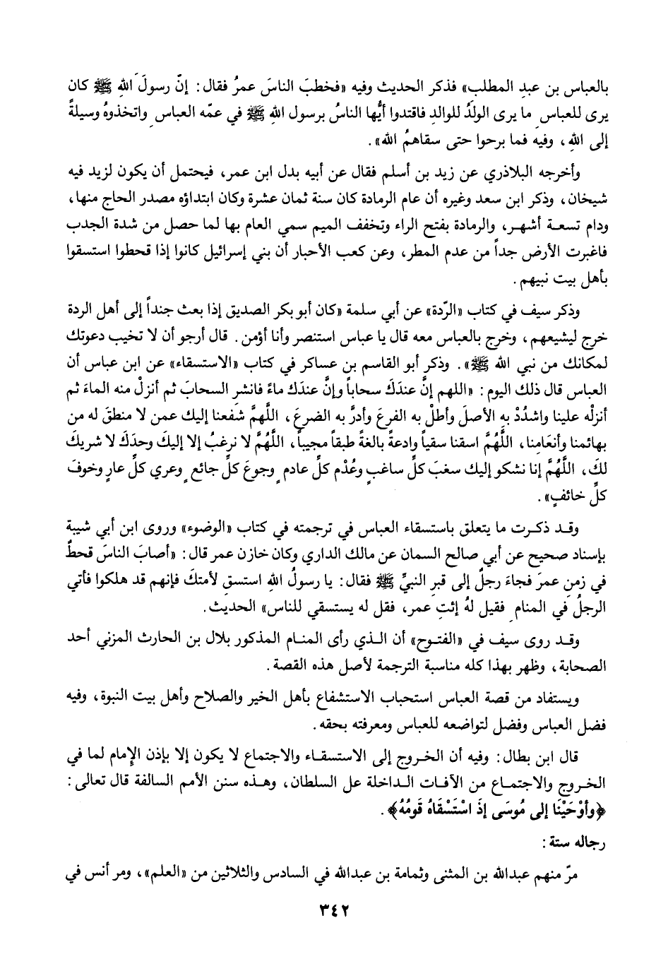 وقد ذكرت ما يتعلق باستسقاء العباس في ترجمته في كتاب "الوضوء" وروى ابن أبي شيبة بإسناد صحيح عن أبي صالح السمان عن مالك الداري وكان خازن عمر قال: "أصابَ الناسَ قحطٌ في زمنِ عمرَ فجاءَ رجلٌ إلى قبرِ النبيِّ -صلى الله عليه وسلم- فقال: يارسولُ اللهِ استسقِ لأمتكَ فإنهم قد هلكوا فأتي الرجلُ في المنامِ فقيل لهُ إئتِ عمر، فقل له يستسقي للناس" الحديث.