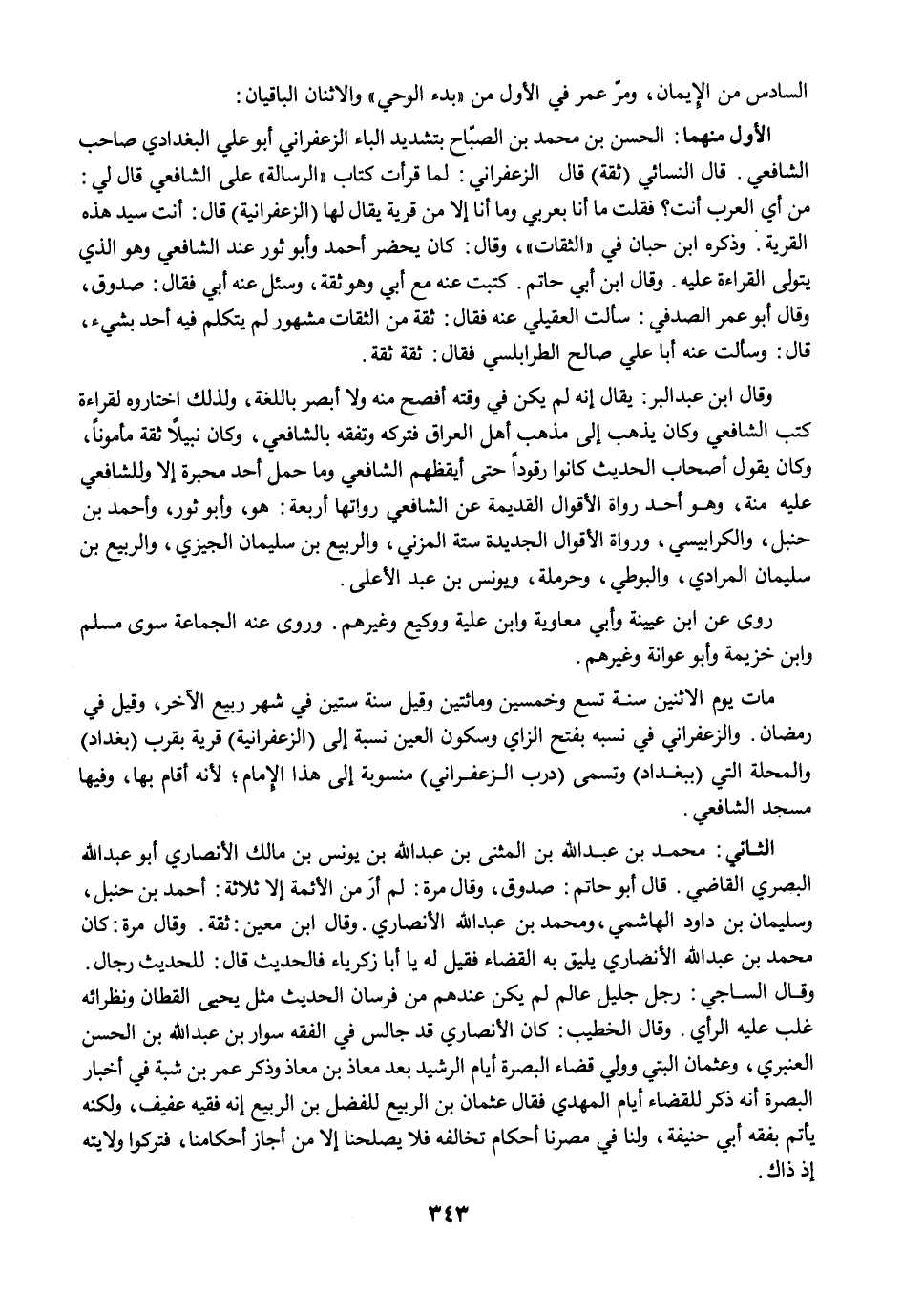 الأول منهما: الحسن بن محمد بن الصبّاح بتشديد الباء الزعفراني أبو علي البغدادي صاحب الشافعي. قال النسائي (ثقة) قال الزعفراني: لما قرأت كتاب "الرسالة" على الشافعي قال لي: من أي العرب أنت؟ فقلت ما أنا بعربي وما أنا إلا من قرية يقال لها (الزعفرانية) قال: أنت سيد هذه القرية. وذكره ابن حبان في "الثقات"، وقال: كان يحضر أحمد وأبو ثور عند الشافعي وهو الذي يتولى القراءة عليه. وقال ابن أبي حاتم. كتبت عنه مع أبي وهو ثقة، وسئل عنه أبي فقال: صدوق، وقال أبو عمر الصدفي: سألت العقيلي عنه فقال: ثقة من الثقات مشهور لم يتكلم فيه أحد بشيء، قال: وسألت عنه أبا علي صالح الطرابلسي فقال: ثقة ثقة.