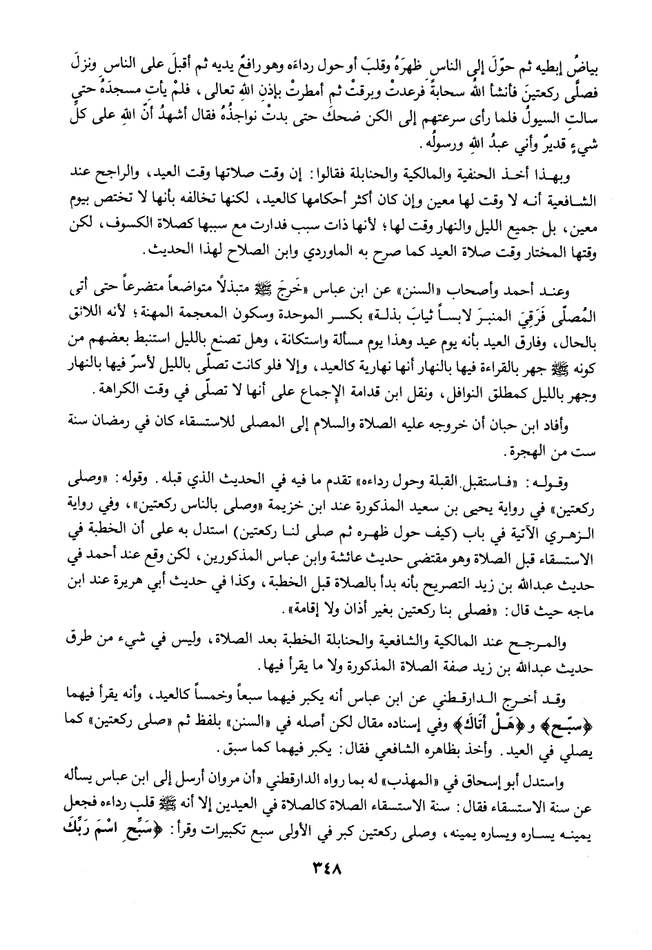 وبهذا أخذ الحنفية والمالكية والحنابلة فقالوا: إن وقت صلاتها وقت العيد، والراجح عند الشافعية أنه لا وقت لها معين وإن كان أكثر أحكامها كالعيد، لكنها تخالفه بأنها لا تختص بيوم معين، بل جميع الليل والنهار وقت لها؛ لأنها ذات سبب فدارت مع سببها كصلاة الكسوف، لكن وقتها المختار وقت صلاة العيد كما صرح به الماوردي وابن الصلاح لهذا الحديث.