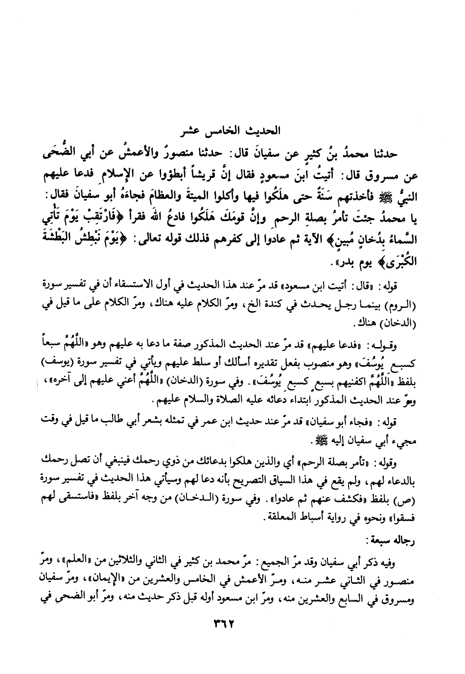 وفيه ذكر أبي سفيان وقد مرّ الجميع: مرّ محمد بن كثير في الثاني والثلاثين من "العلم"، ومرَّ منصور في الثاني عشر منه، ومرّ الأعمش في الخاص والعشرين من "الإيمان"، ومرَّ سفيان ومسروق في السابع والعشرين منه، ومرّ ابن مسعود أوله قبل ذكر حديث منه، ومرَّ أبو الضحى في