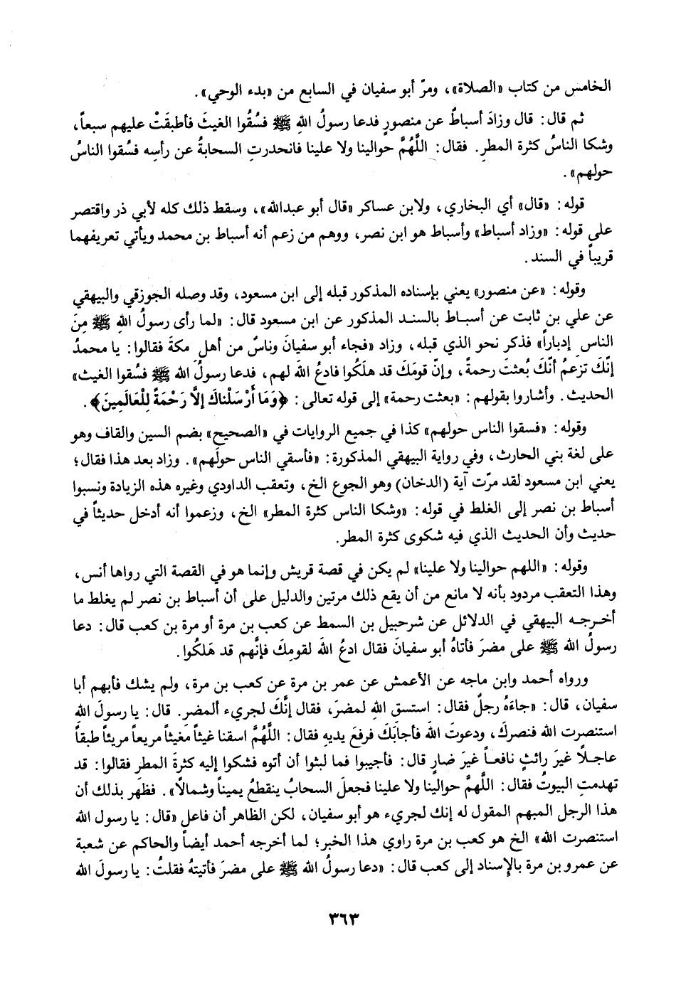 وقوله: "اللهم حوالينا ولا علينا" لم يكن في قصة قريش وإنما هو في القصة التي رواها أنس، وهذا التعقب مردود بأنه لا مانع من أن يقع ذلك مرتين والدليل على أن أسباط بن نصر لم يغلط ما أخرجه البيهقي في الدلائل عن شرحبيل بن السمط عن كعب بن مرة أو مرة بن كعب قال: دعا رسولُ الله -صلى الله عليه وسلم- على مضرَ فأتاهُ أبو سفيانَ فقال ادعُ اللهَ لقومِكَ فإنَّهم قد هَلكُوا.