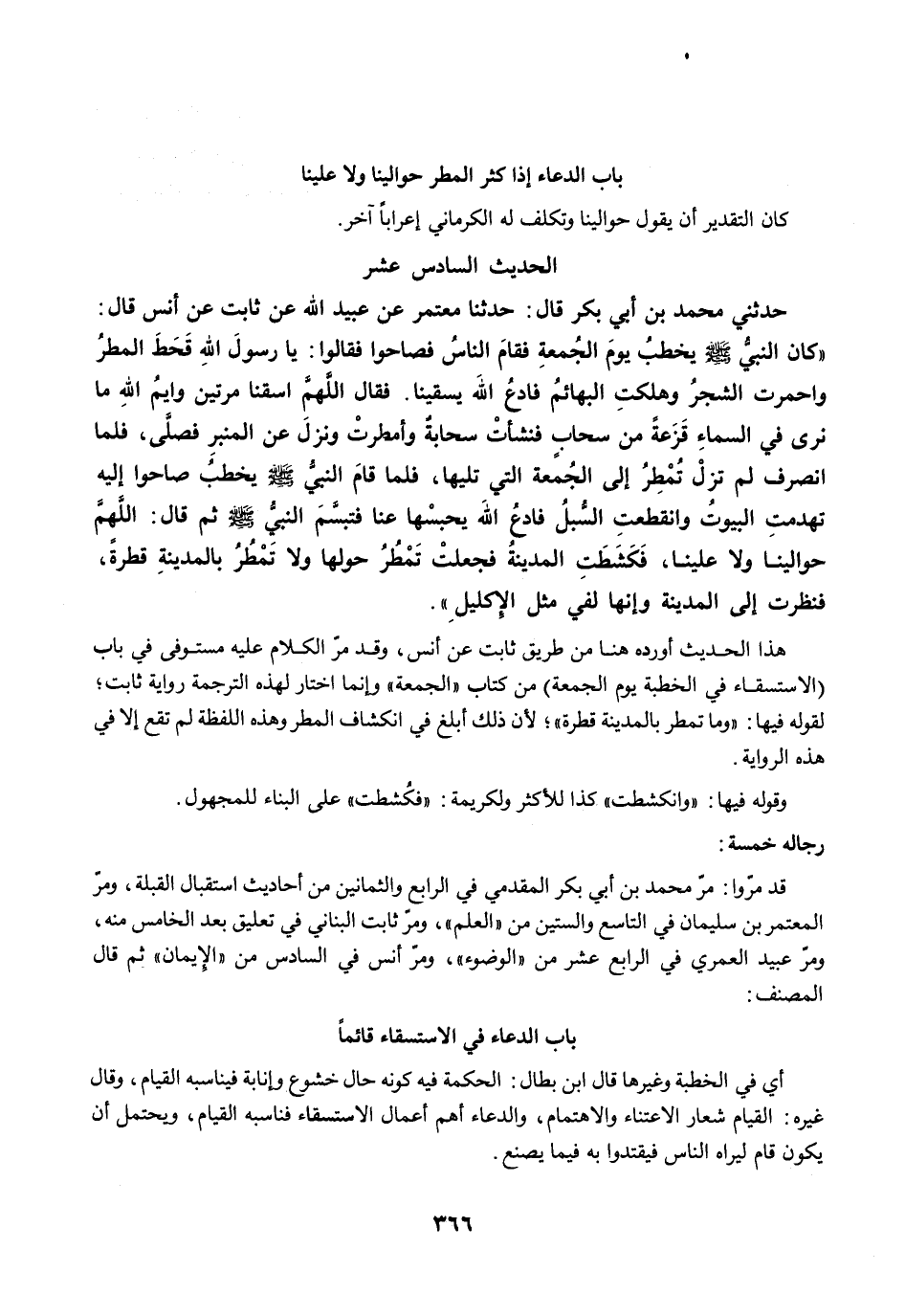 حَدَّثَنَا مُحَمَّدُ بْنُ أَبِي بَكْرٍ قَالَ: حَدَّثَنَا مُعْتَمِرٌ عَنْ عُبَيْدِ اللَّهِ عَنْ ثَابِتٍ عَنْ أَنَسٍ قَالَ: "كَانَ النَّبِيُّ -صلى الله عليه وسلم- يَخْطُبُ يَوْمَ جُمُعَةٍ، فَقَامَ النَّاسُ فَصَاحُوا فَقَالُوا: يَا رَسُولَ اللَّهِ، قَحَطَ الْمَطَرُ وَاحْمَرَّتِ الشَّجَرُ وَهَلَكَتِ الْبَهَائِمُ، فَادْعُ اللَّهَ يَسْقِينَا. فَقَالَ اللَّهُمَّ اسْقِنَا. مَرَّتَيْنِ، وَايْمُ اللَّهِ مَا نَرَى فِي السَّمَاءِ قَزَعَةً مِنْ سَحَابٍ، فَنَشَأَتْ سَحَابَةٌ وَأَمْطَرَتْ، وَنَزَلَ عَنِ الْمِنْبَرِ فَصَلَّى، فَلَمَّا انْصَرَفَ لَمْ تَزَلْ تُمْطِرُ إِلَى الْجُمُعَةِ الَّتِى تَلِيهَا، فَلَمَّا قَامَ النَّبِيُّ -صلى الله عليه وسلم- يَخْطُبُ صَاحُوا إِلَيْهِ تَهَدَّمَتِ الْبُيُوتُ وَانْقَطَعَتِ السُّبُلُ، فَادْعُ اللَّهَ يَحْبِسُهَا عَنَّا. فَتَبَسَّمَ النَّبِيُّ -صلى الله عليه وسلم- ثُمَّ قَالَ: اللَّهُمَّ حَوَالَيْنَا وَلاَ عَلَيْنَا. فَكُشِطَتِ الْمَدِينَةُ، فَجَعَلَتْ تُمْطِرُ حَوْلَهَا وَلاَ تَمْطُرُ بِالْمَدِينَةِ قَطْرَةً، فَنَظَرْتُ إِلَى الْمَدِينَةِ وَإِنَّهَا لَفِي مِثْلِ الإِكْلِيلِ".