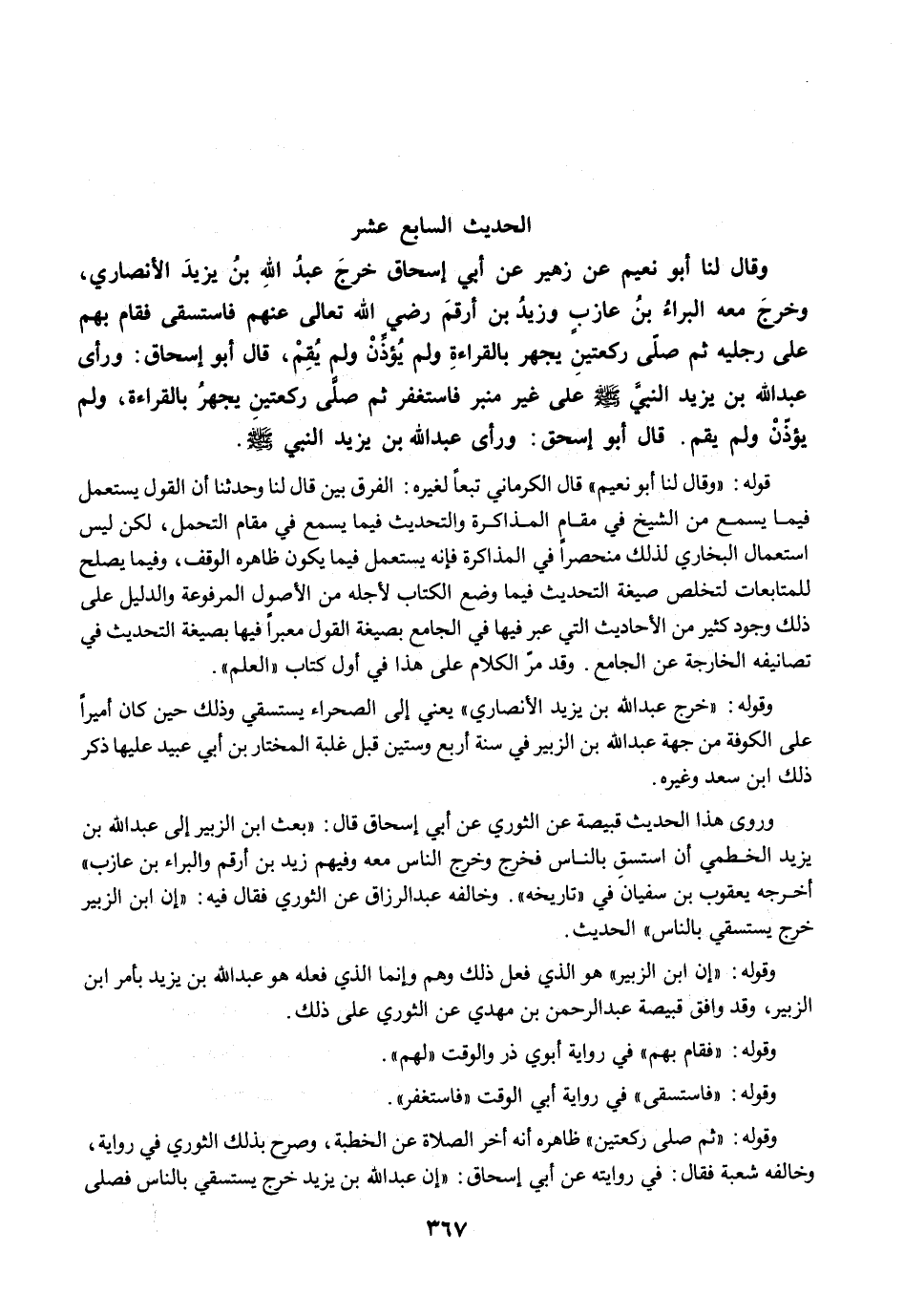 وَقَالَ لَنَا أَبُو نُعَيْمٍ عَنْ زُهَيْرٍ عَنْ أَبِي إِسْحَاقَ خَرَجَ عَبْدُ اللَّهِ بْنُ يَزِيدَ الأَنْصَارِيُّ وَخَرَجَ مَعَهُ الْبَرَاءُ بْنُ عَازِبٍ وَزَيْدُ بْنُ أَرْقَمَ رضي الله عنهم فَاسْتَسْقَى، فَقَامَ بِهِمْ عَلَى رِجْلَيْهِ ثُمَّ صَلَّى رَكْعَتَيْنِ يَجْهَرُ بِالْقِرَاءَةِ وَلَمْ يُؤَذِّنْ، وَلَمْ يُقِمْ. قَالَ أَبُو إِسْحَاقَ: وَرَأَى عَبْدُ اللَّهِ بْنُ يَزِيدَ النَّبِيَّ -صلى الله عليه وسلم- عَلَى غَيْرِ مِنْبَرٍ فَاسْتَغْفَرَ، ثُمَّ صَلَّى رَكْعَتَيْنِ يَجْهَرُ بِالْقِرَاءَةِ وَلَمْ يُؤَذِّنْ، وَلَمْ يُقِمْ. قَالَ أَبُو إِسْحَاقَ: وَرَأَى عَبْدُ اللَّهِ بْنُ يَزِيدَ النَّبِيَّ -صلى الله عليه وسلم-.