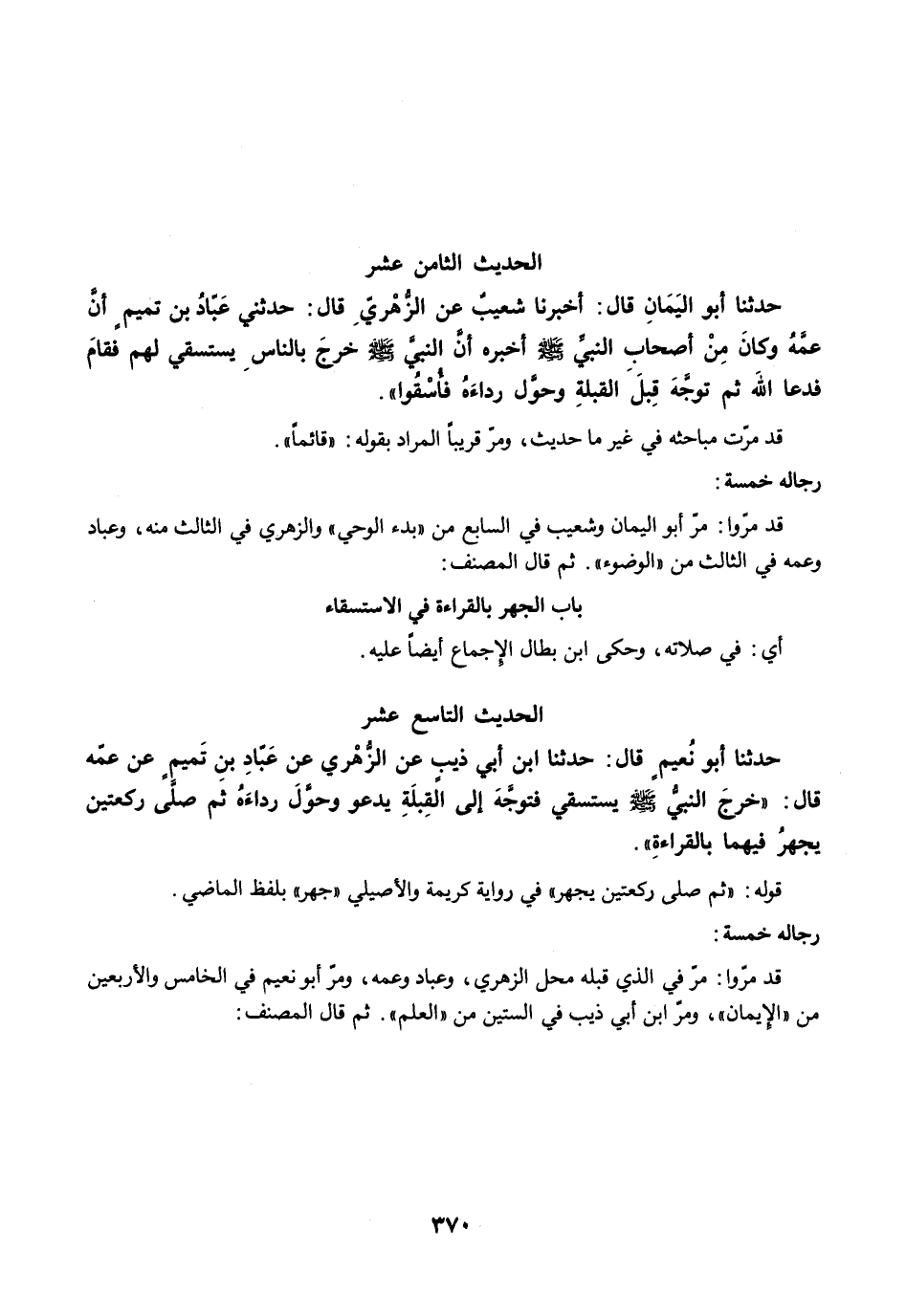 حَدَّثَنَا أَبُو نُعَيْمٍ قَالَ: حَدَّثَنَا ابْنُ أَبِي ذِئْبٍ عَنِ الزُّهْرِيِّ عَنْ عَبَّادِ بْنِ تَمِيمٍ عَنْ عَمِّهِ قَالَ: "خَرَجَ النَّبِيُّ -صلى الله عليه وسلم- يَسْتَسْقِي فَتَوَجَّهَ إِلَى الْقِبْلَةِ يَدْعُو، وَحَوَّلَ رِدَاءَهُ، ثُمَّ صَلَّى رَكْعَتَيْنِ جَهَرَ فِيهِمَا بِالْقِرَاءَةِ".