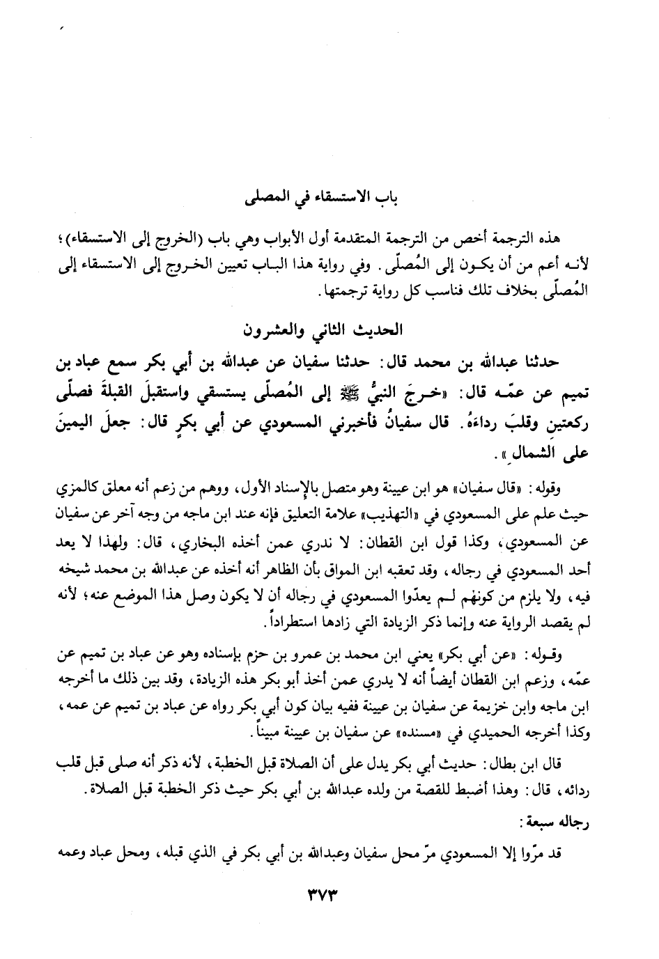حَدَّثَنَا عَبْدُ اللَّهِ بْنُ مُحَمَّدٍ قَالَ: حَدَّثَنَا سُفْيَانُ عَنْ عَبْدِ اللَّهِ بْنِ أَبِي بَكْرٍ سَمِعَ عَبَّادَ بْنَ تَمِيمٍ عَنْ عَمِّهِ قَالَ: "خَرَجَ النَّبِيُّ -صلى الله عليه وسلم- إِلَى الْمُصَلَّى يَسْتَسْقِي، وَاسْتَقْبَلَ الْقِبْلَةَ فَصَلَّى رَكْعَتَيْنِ، وَقَلَبَ رِدَاءَهُ. قَالَ سُفْيَانُ فَأَخْبَرَنِي الْمَسْعُودِيُّ عَنْ أَبِي بَكْرٍ قَالَ: جَعَلَ الْيَمِينَ عَلَى الشِّمَالِ".
