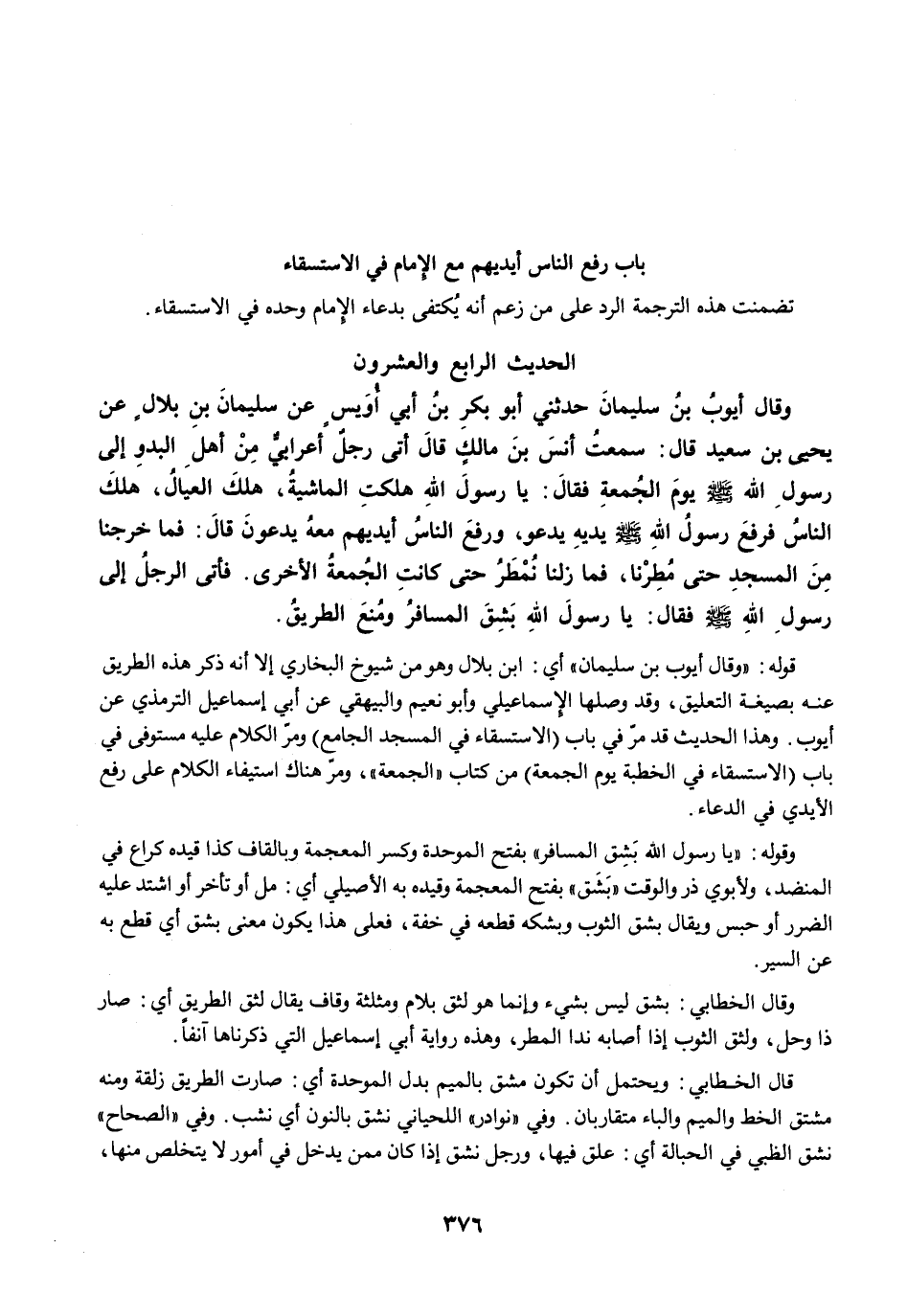 قَالَ أَيُّوبُ بْنُ سُلَيْمَانَ حَدَّثَنِي أَبُو بَكْرِ بْنُ أَبِي أُوَيْسٍ عَنْ سُلَيْمَانَ بْنِ بِلاَلٍ قَالَ يَحْيَى بْنُ سَعِيدٍ قَالَ: سَمِعْتُ أَنَسَ بْنَ مَالِكٍ قَالَ أَتَى رَجُلٌ أَعْرَابِيٌّ مِنْ أَهْلِ الْبَدْوِ إِلَى رَسُولِ اللَّهِ -صلى الله عليه وسلم- يَوْمَ الْجُمُعَةِ فَقَالَ: يَا رَسُولَ اللَّهِ، هَلَكَتِ الْمَاشِيَةُ هَلَكَ الْعِيَالُ هَلَكَ النَّاسُ. فَرَفَعَ رَسُولُ اللَّهِ -صلى الله عليه وسلم- يَدَيْهِ يَدْعُو، وَرَفَعَ النَّاسُ أَيْدِيَهُمْ مَعَهُ يَدْعُونَ، قَالَ: فَمَا خَرَجْنَا مِنَ الْمَسْجِدِ حَتَّى مُطِرْنَا، فَمَا زِلْنَا نُمْطَرُ حَتَّى كَانَتِ الْجُمُعَةُ الأُخْرَى، فَأَتَى الرَّجُلُ إِلَى نَبِيِّ اللَّهِ -صلى الله عليه وسلم- فَقَالَ: يَا رَسُولَ اللَّهِ، بَشِقَ الْمُسَافِرُ، وَمُنِعَ الطَّرِيقُ.