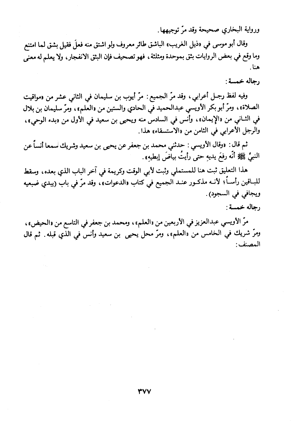 مرّ الأويسى عبد العزيز في الأربعين من "العلم"، ومحمد بن جعفر في التاسع من "الحيض"، ومرّ شريك في الخامس من "العلم"، ومرّ محل يحيى بن سعيد وأنس في الذي قبله. ثم قال المصنف: