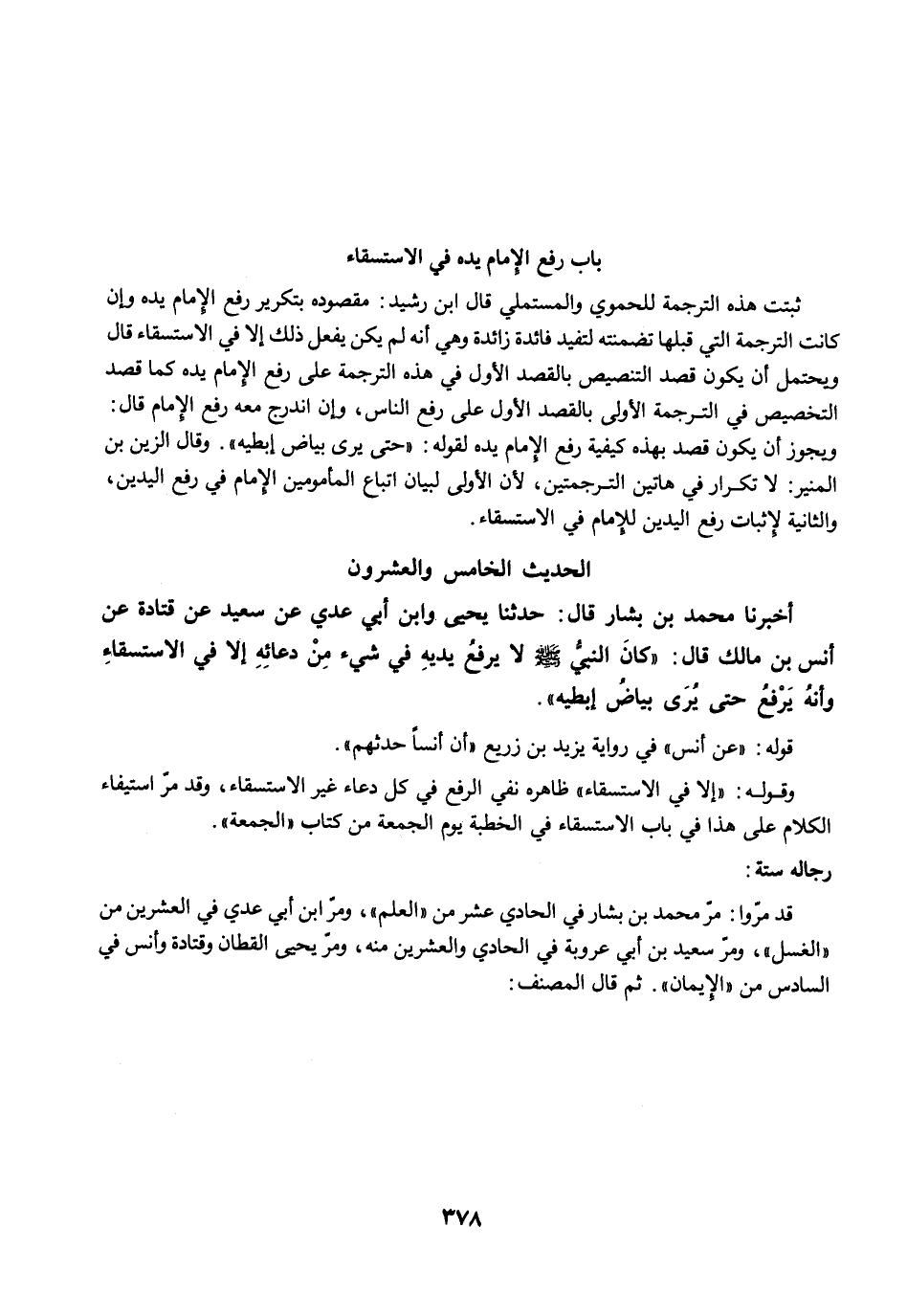 أخبرنا مُحَمَّدُ بْنُ بَشَّارٍ قَالَ: حَدَّثَنَا يَحْيَى وَابْنُ أَبِي عَدِىٍّ عَنْ سَعِيدٍ عَنْ قَتَادَةَ عَنْ أَنَسِ بْنِ مَالِكٍ قَالَ: "كَانَ النَّبِيُّ -صلى الله عليه وسلم- لاَ يَرْفَعُ يَدَيْهِ فِي شَيْءٍ مِنْ دُعَائِهِ إِلاَّ فِي الاِسْتِسْقَاءِ، وَإِنَّهُ يَرْفَعُ حَتَّى يُرَى بَيَاضُ إِبْطَيْهِ".