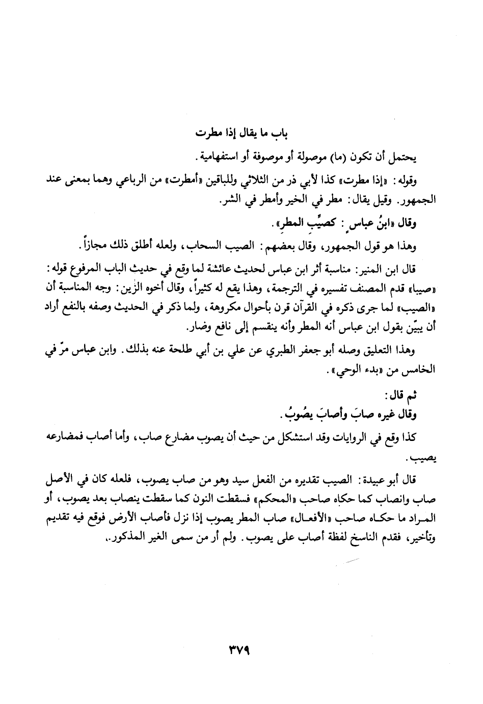 قال أبو عبيدة: الصيب تقديره من الفعل سيد وهو من صاب يصوب، فلعله كان في الأصل صاب وانصاب كما حكاه صاحب "المحكم" فسقطت النون كما سقطت ينصاب بعد يصوب، أو المراد ما حكاه صاحب "الأفعال" صاب المطر يصوب إذا نزل فأصاب الأرض فوقع فيه تقديم وتأخير، فقدم الناسخ لفظة أصاب على يصوب. ولم أر من سمى الغير المذكور.