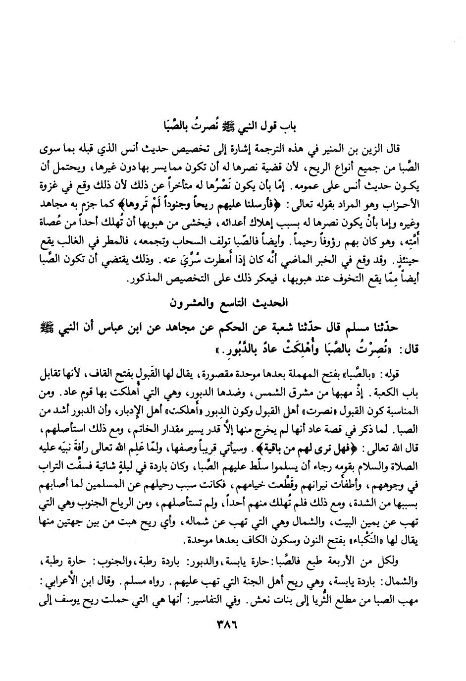 قال الزين بن المنير في هذه الترجمة إشارة إلى تخصيص حديث أنس الذي قبله بما سوى الصَّبا من جميع أنواع الريح؛ لأن قضية نصرها له أن تكون مما يسر بها دون غيرها، ويحتمل أن يكون حديث أنس على عمومه. إمّا بأن يكون نَصْرُها له متأخرًا عن ذلك لأن ذلك وقع في غزوة الأحزاب وهو المراد بقوله تعالى: {فَأَرْسَلْنَا عَلَيْهِمْ رِيحًا وَجُنُودًا لَمْ تَرَوْهَا} كما جزم به مجاهد وغيره وإما بأنْ يكون نصرها له بسبب إهلاك أعدائه، فيخشى من هبوبها أن تُهلك أحدًا من عُصاة أُمَّتِه، وهو كان بهم رؤوفًا رحيمًا. وأيضًا فالصَّبا تولف السحاب وتجمعه، فالمطر في الغالب يقع حينئذٍ. وقد وقع في الخبر الماضي أنَّه كان إذا أَمطرت سُرِّيَ عنه. وذ لك يقتضي أن تكون الصَّبا أيضًا مِمَّا يقع التخوف عند هبوبها، فيعكر ذلك على التخصيص المذكور.