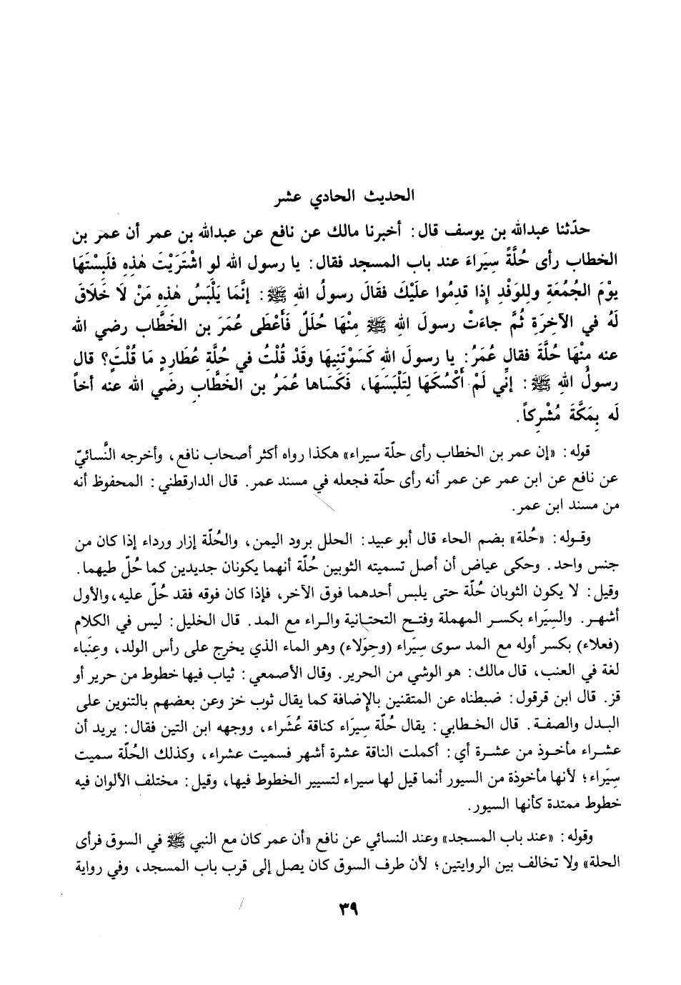 قوله: "إن عمر بن الخطاب رأى حلّة سيراء" هكذا رواه أكثر أصحاب نافع، وأخرجه النَّسائيّ عن نافع عن ابن عمر عن عمر أنه رأى حلّة فجعله في مسند عمر. قال الدارقطني: المحفوظ أنه من مسند ابن عمر.