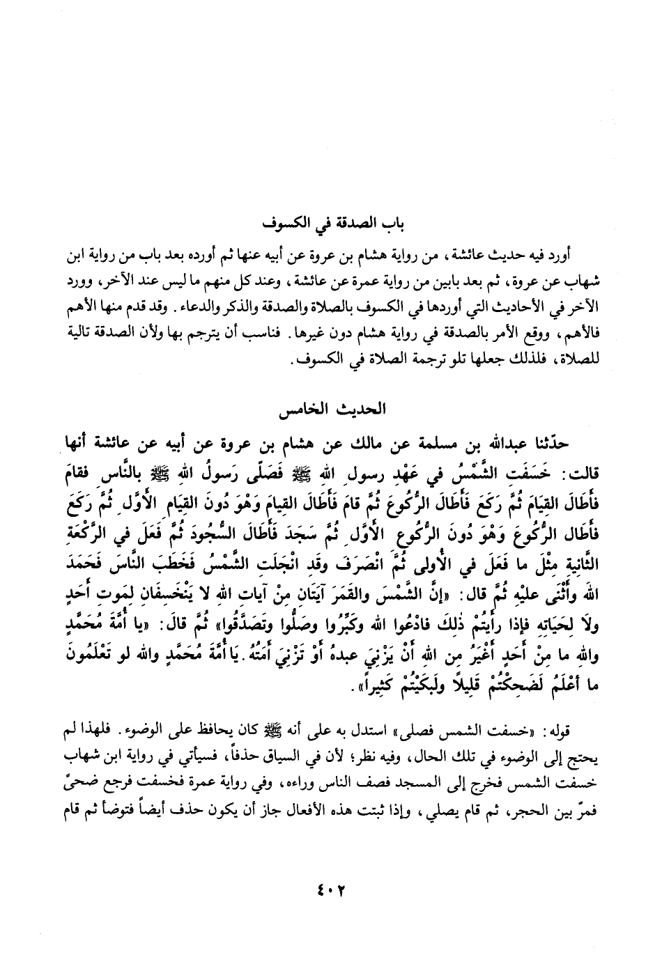 حَدَّثَنَا عَبْدُ اللَّهِ بْنُ مَسْلَمَةَ عَنْ مَالِكٍ عَنْ هِشَامِ بْنِ عُرْوَةَ عَنْ أَبِيهِ عَنْ عَائِشَةَ أَنَّهَا قَالَتْ: خَسَفَتِ الشَّمْسُ فِي عَهْدِ رَسُولِ اللَّهِ -صلى الله عليه وسلم- فَصَلَّى رَسُولُ اللَّهِ -صلى الله عليه وسلم- بِالنَّاسِ، فَقَامَ فَأَطَالَ الْقِيَامَ، ثُمَّ رَكَعَ فَأَطَالَ الرُّكُوعَ، ثُمَّ قَامَ فَأَطَالَ الْقِيَامَ وَهْوَ دُونَ الْقِيَامِ الأَوَّلِ، ثُمَّ رَكَعَ فَأَطَالَ الرُّكُوعَ، وَهْوَ دُونَ الرُّكُوعِ الأَوَّلِ، ثُمَّ سَجَدَ فَأَطَالَ السُّجُودَ، ثُمَّ فَعَلَ فِي الرَّكْعَةِ الثَّانِيَةِ مِثْلَ مَا فَعَلَ فِي الأُولَى، ثُمَّ انْصَرَفَ وَقَدِ انْجَلَتِ الشَّمْسُ، فَخَطَبَ النَّاسَ، فَحَمِدَ اللَّهَ، وَأَثْنَى عَلَيْهِ ثُمَّ قَالَ: "إِنَّ الشَّمْسَ وَالْقَمَرَ آيَتَانِ مِنْ آيَاتِ اللَّهِ، لاَ يَنْخَسِفَانِ لِمَوْتِ أَحَدٍ وَلاَ لِحَيَاتِهِ، فَإِذَا رَأَيْتُمْ ذَلِكَ فَادْعُوا اللَّهَ وَكَبِّرُوا، وَصَلُّوا وَتَصَدَّقُوا". ثُمَّ قَالَ: "يَا أُمَّةَ مُحَمَّدٍ، وَاللَّهِ مَا مِنْ أَحَدٍ أَغْيَرُ مِنَ اللَّهِ أَنْ يَزْنِيَ عَبْدُهُ أَوْ تَزْنِيَ أَمَتُهُ، يَا أُمَّةَ مُحَمَّدٍ، وَاللَّهِ لَوْ تَعْلَمُونَ مَا أَعْلَمُ لَضَحِكْتُمْ قَلِيلاً وَلَبَكَيْتُمْ كَثِيرًا".