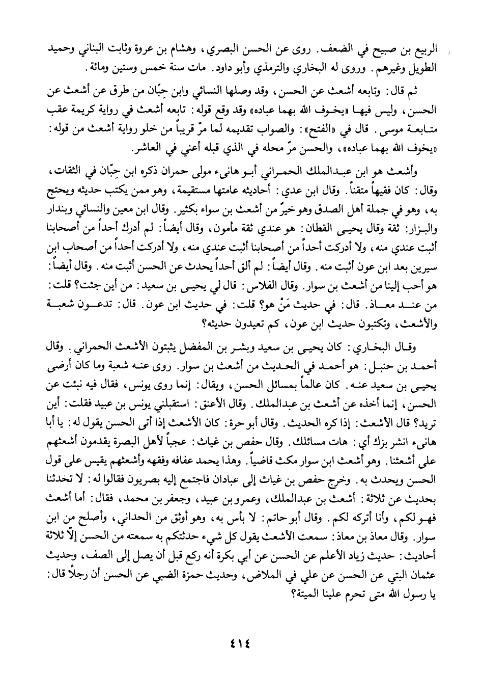 وأشعث هو ابن عبد الملك الحمراني أبو هانىء مولى حمران ذكره ابن حِبّان في الثقات، وقال: كان فقيهًا متقنًا. وقال ابن عدي: أحاديثه عامتها مستقيمة، وهو ممن يكتب حديثه ويحتج به، وهو في جملة أهل الصدق وهو خيرٌ من أشعث بن سواء بكثير. وقال ابن معين والنسائي وبندار والبزار: ثقة وقال يحيى القطان: هو عندي ثقة مأمون، وقال أيضًا: لم أدرك أحدًا من أصحابنا أثبت عندي منه، ولا أدركت أحدًا من أصحابنا أثبت عندي منه، ولا أدركت أحدًا من أصحاب ابن سيرين بعد ابن عون أثبت منه. وقال أيضًا: لم ألق أحدًا يحدث عن الحسن أثبت منه. وقال أيضًا: هو أحب الينا من أشعث بن سوار. وقال الفلاس: قال لي يحيى بن سعيد: من أين جئت؟ قلت: من عند معاذ. قال: في حديث مَنْ هو؟ قلت: في حديث ابن عون. قال: تدعون شعبة والأشعث، وتكتبون حديث ابن عون، كم تعيدون حديثه؟