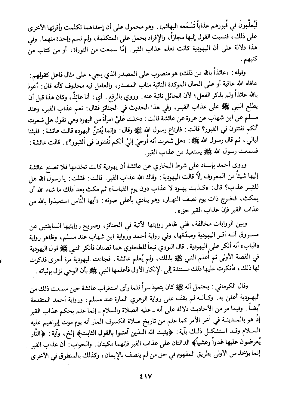وروى أحمد بإسناد على شرط البخاري عن عائشة أن يهودية كانت تخدمها فلا تصنع عائشة إليها شيئًا من المعروف إلاَّ قالت اليهودية: وقال الله عذاب القبر. قالت: فقلت: يا رسول الله هل للقبر عذاب؟ قال: "كذبت يهود لا عذاب دون يوم القيامة" ثم مكث بعد ذلك ما شاء الله أن يمكث، فخرج ذات يوم نصف النهار، وهو ينادي بأعلى صوته: "أيها النَّاس استعيذوا بالله من عذاب القبر فإن عذاب القبر حق".