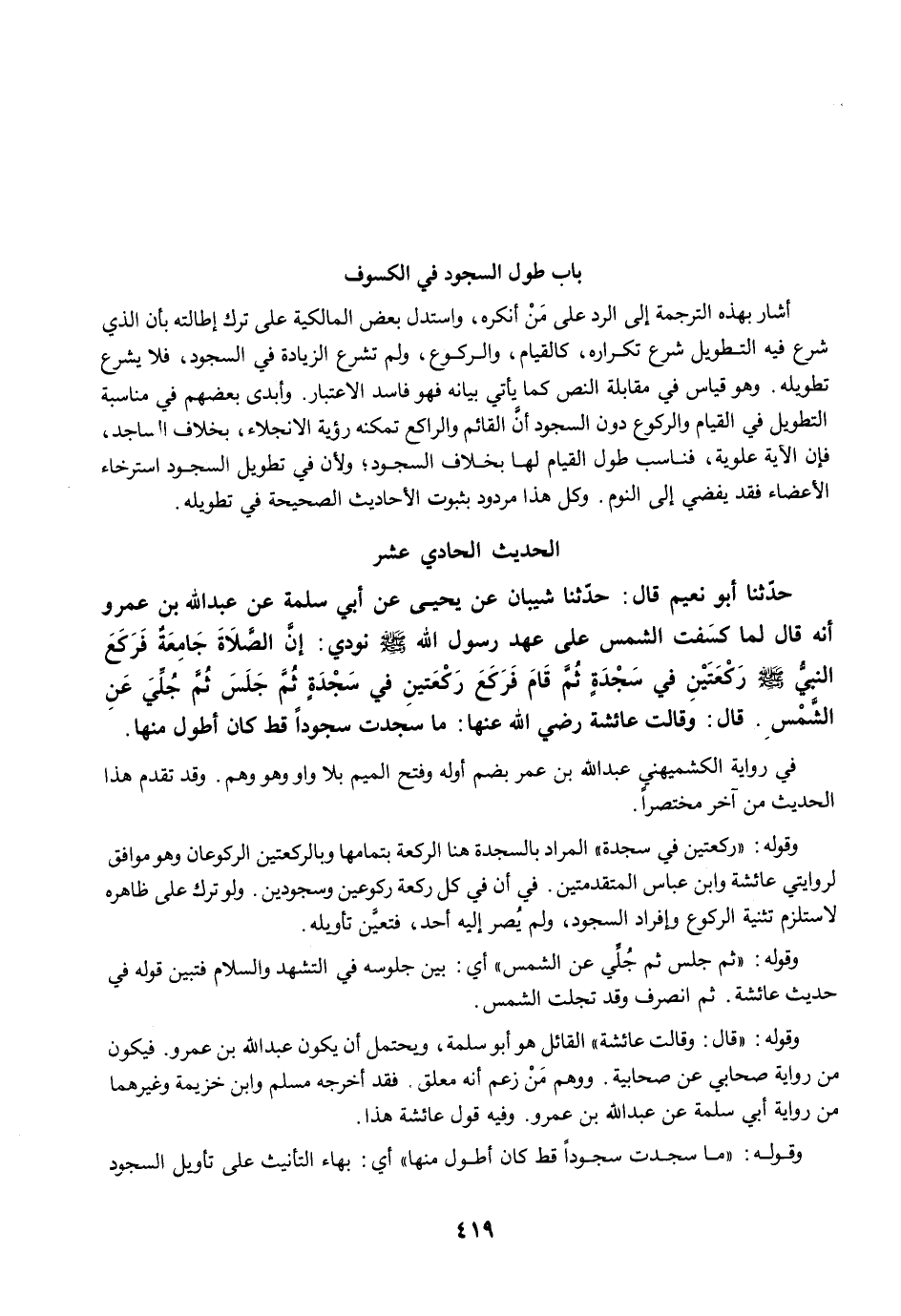 حَدَّثَنَا أَبُو نُعَيْمٍ قَالَ: حَدَّثَنَا شَيْبَانُ عَنْ يَحْيَى عَنْ أَبِي سَلَمَةَ عَنْ عَبْدِ اللَّهِ بْنِ عَمْرٍو أَنَّهُ قَالَ لَمَّا كَسَفَتِ الشَّمْسُ عَلَى عَهْدِ رَسُولِ اللَّهِ -صلى الله عليه وسلم- نُودِيَ: إِنَّ الصَّلاَةَ جَامِعَةٌ فَرَكَعَ النَّبِيُّ -صلى الله عليه وسلم- رَكْعَتَيْنِ فِي سَجْدَةٍ ثُمَّ قَامَ فَرَكَعَ رَكْعَتَيْنِ فِي سَجْدَةٍ، ثُمَّ جَلَسَ، ثُمَّ جُلِّيَ عَنِ الشَّمْسِ. قَالَ: وَقَالَتْ عَائِشَةُ رضي الله عنها: مَا سَجَدْتُ سُجُودًا قَطُّ كَانَ أَطْوَلَ مِنْهَا.