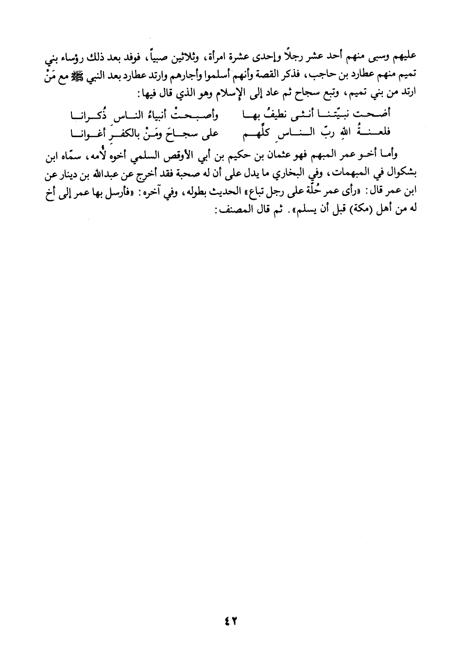 عليهم وسبى منهم أحد عشر رجلًا وإحدى عشرة امرأة، وثلاثين صبيًا، فوفد بعد ذلك رؤساء بني تميم منهم عطارد بن حاجب، فذكر القصة وأنهم أسلموا وأجارهم وارتد عطارد بعد النبي -صلى الله عليه وسلم- مع مَنْ ارتد من بني تميم، وتبع سجاح ثم عاد إلى الإِسلام وهو الذي قال فيها:
