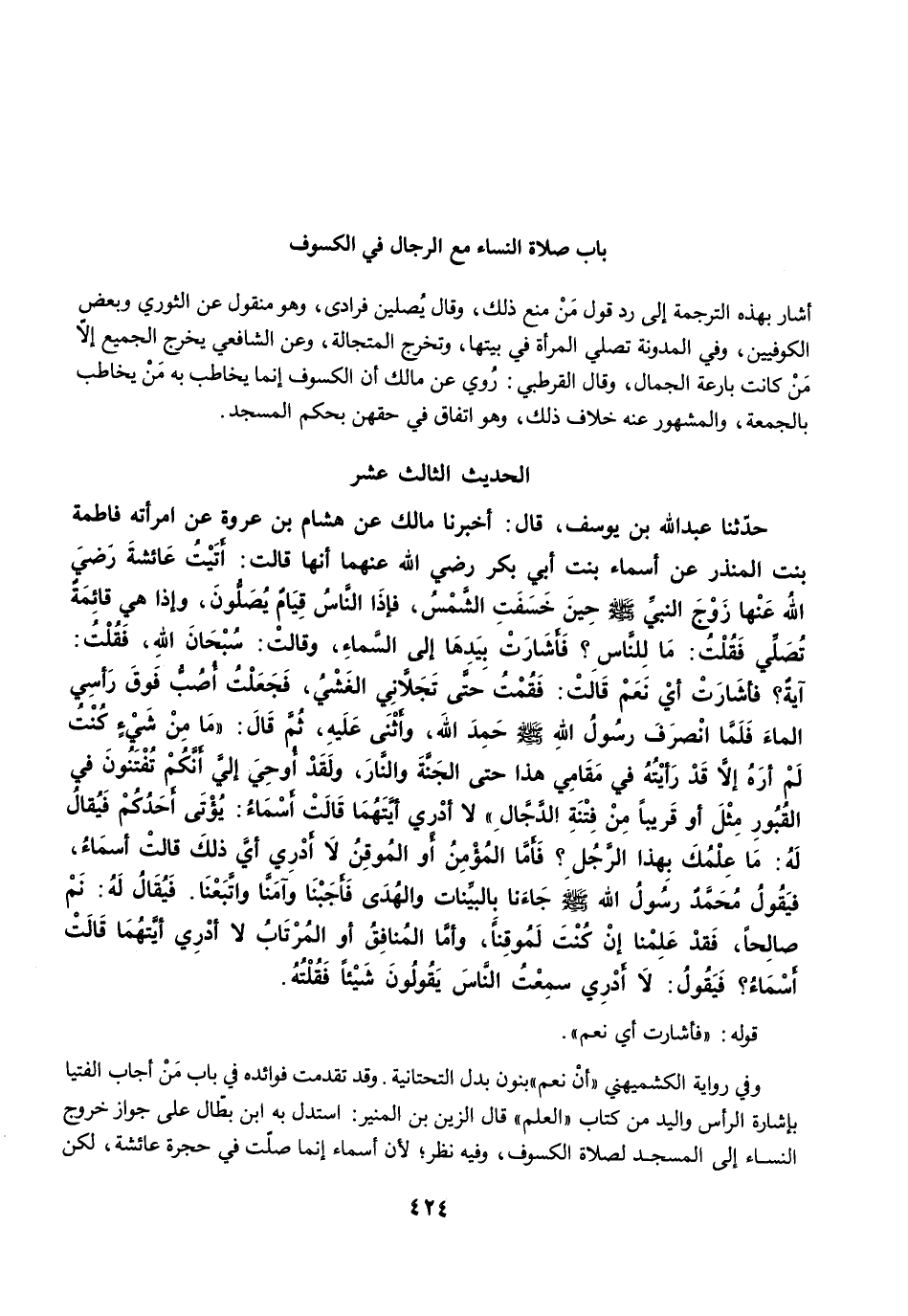 حَدَّثَنَا عَبْدُ اللَّهِ بْنُ يُوسُفَ، قَالَ: أَخْبَرَنَا مَالِكٌ عَنْ هِشَامِ بْنِ عُرْوَةَ عَنِ امْرَأَتِهِ فَاطِمَةَ بِنْتِ الْمُنْذِرِ عَنْ أَسْمَاءَ بِنْتِ أَبِي بَكْرٍ رضي الله عنهما أَنَّهَا قَالَتْ: أَتَيْتُ عَائِشَةَ رضي الله عنها زَوْجَ النَّبِيِّ -صلى الله عليه وسلم- حِينَ خَسَفَتِ الشَّمْسُ، فَإِذَا النَّاسُ قِيَامٌ يُصَلُّونَ، وَإِذَا هِيَ قَائِمَةٌ تُصَلِّي فَقُلْتُ: مَا لِلنَّاسِ؟ فَأَشَارَتْ بِيَدِهَا إِلَى السَّمَاءِ، وَقَالَتْ: سُبْحَانَ اللَّهِ. فَقُلْتُ: آيَةٌ؟ فَأَشَارَتْ أَيْ نَعَمْ. قَالَتْ: فَقُمْتُ حَتَّى تَجَلاَّنِي الْغَشْيُ، فَجَعَلْتُ أَصُبُّ فَوْقَ رَأْسِي الْمَاءَ، فَلَمَّا انْصَرَفَ رَسُولُ اللَّهِ -صلى الله عليه وسلم- حَمِدَ اللَّهَ وَأَثْنَى عَلَيْهِ ثُمَّ قَالَ: "مَا مِنْ شَيْءٍ كُنْتُ لَمْ أَرَهُ إِلاَّ قَدْ رَأَيْتُهُ فِي مَقَامِي هَذَا حَتَّى الْجَنَّةَ وَالنَّارَ، وَلَقَدْ أُوحِيَ إِلَيَّ أَنَّكُمْ تُفْتَنُونَ فِي الْقُبُورِ مِثْلَ أَوْ قَرِيبًا مِنْ فِتْنَةِ الدَّجَّالِ" لاَ أَدْرِى أَيَّتَهُمَا قَالَتْ أَسْمَاءُ: يُؤْتَى أَحَدُكُمْ فَيُقَالُ لَهُ: مَا عِلْمُكَ بِهَذَا الرَّجُلِ؟ فَأَمَّا الْمُؤْمِنُ أَوِ الْمُوقِنُ لاَ أَدْرِي أَيَّ ذَلِكَ قَالَتْ أَسْمَاءُ، فَيَقُولُ مُحَمَّدٌ رَسُولُ اللَّهِ -صلى الله عليه وسلم- جَاءَنَا بِالْبَيِّنَاتِ وَالْهُدَى، فَأَجَبْنَا وَآمَنَّا وَاتَّبَعْنَا. فَيُقَالُ لَهُ: نَمْ صَالِحًا، فَقَدْ عَلِمْنَا إِنْ كُنْتَ لَمُوقِنًا. وَأَمَّا الْمُنَافِقُ أَوِ الْمُرْتَابُ لاَ أَدْرِي أَيَّتَهُمَا قَالَتْ أَسْمَاءُ؟ فَيَقُولُ: لاَ أَدْرِي، سَمِعْتُ النَّاسَ يَقُولُونَ شَيْئًا فَقُلْتُهُ.