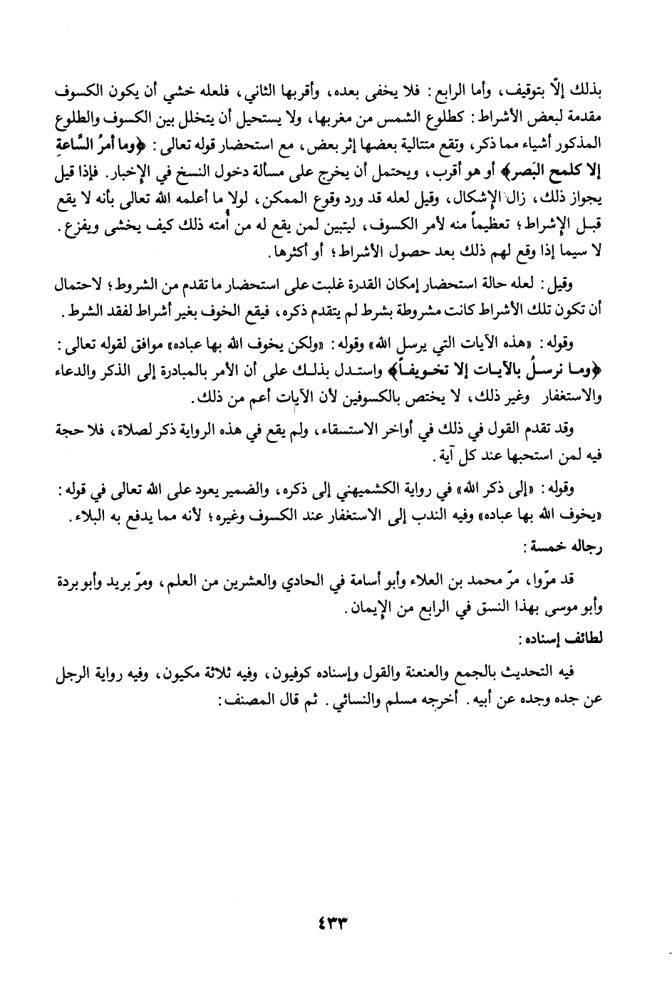 بذلك إلاَّ بتوقيف، وأما الرابع: فلا يخفى بعده، وأقربها الثاني، فلعله خشي أن يكون الكسوف مقدمة لبعض الأشراط: كطلوع الشمس من مغربها، ولا يستحيل أن يتخلل بين الكسوف والطلوع المذكور أشياء مما ذكر، وتقع متتالية بعضها إثر بعض، مع استحضار قوله تعالى: {وَمَا أَمْرُ السَّاعَةِ إِلَّا كَلَمْحِ الْبَصَرِ} أو هو أقرب، ويحتمل أن يخرج على مسألة دخول النسخ في الإخبار. فإذا قيل يجواز ذلك، زال الإشكال، وقيل لعله قد ورد وقوع الممكن، لولا ما أعلمه الله تعالى بأنه لا يقع قبل الإشراط؛ تعظيمًا منه لأمر الكسوف، ليتبين لمن يقع له من أُمته ذلك كيف يخشى ويفزع. لاسيما إذا وقع لهم ذلك بعد حصول الأشراط؛ أو أكثرها.