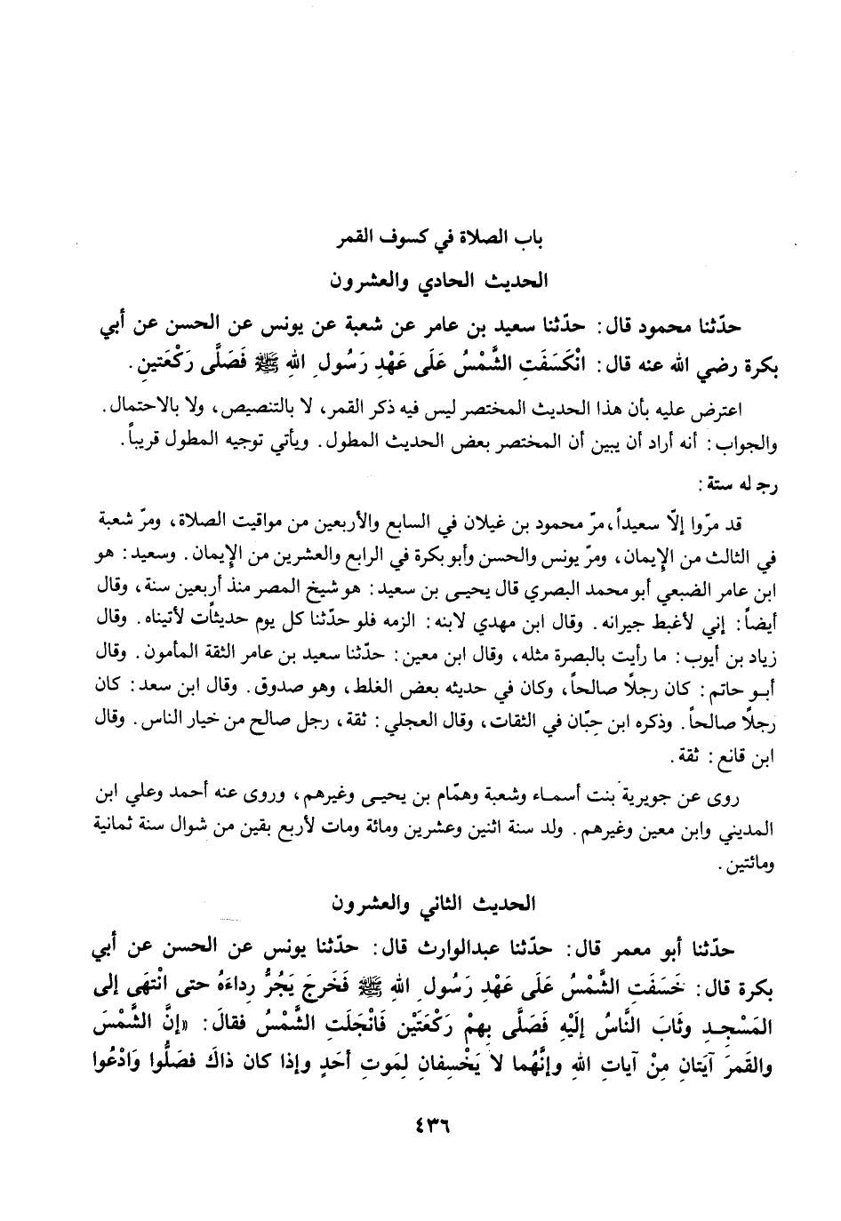 حَدَّثَنَا مَحْمُودٌ قَالَ: حَدَّثَنَا سَعِيدُ بْنُ عَامِرٍ عَنْ شُعْبَةَ عَنْ يُونُسَ عَنِ الْحَسَنِ عَنْ أَبِي بَكْرَةَ رضي الله عنه قَالَ: انْكَسَفَتِ الشَّمْسُ عَلَى عَهْدِ رَسُولِ اللَّهِ -صلى الله عليه وسلم- فَصَلَّى رَكْعَتَيْنِ.