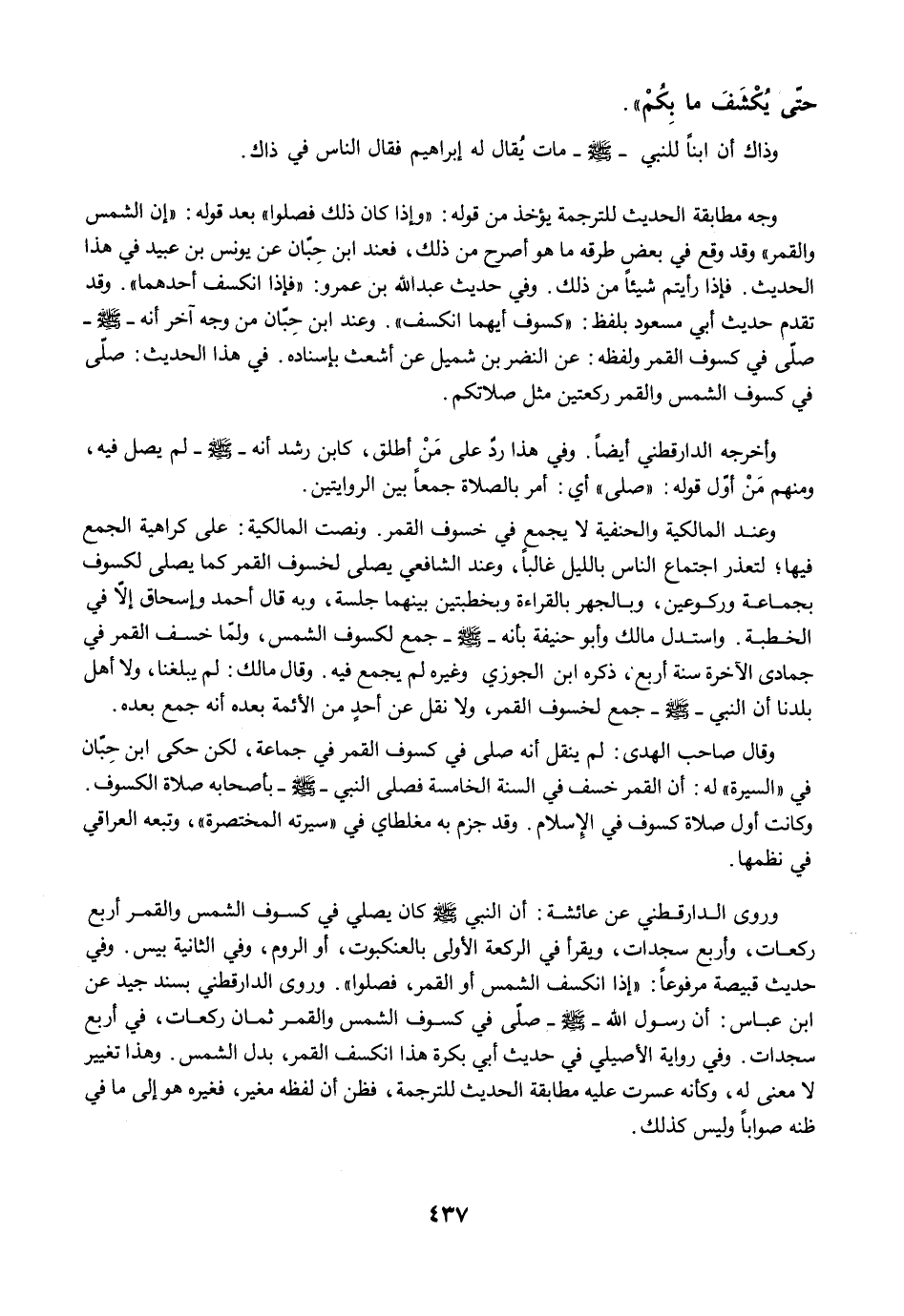 وقال صاحب الهدى: لم ينقل أنه صلى في كسوف القمر في جماعة، لكن حكى ابن حِبّان في "السيرة" له: أن القمر خسف في السنة الخامسة فصلى النبي -صلى الله عليه وسلم- بأصحابه صلاة الكسوف. وكانت أول صلاة كسوف في الإِسلام. وقد جزم به مغلطاي في "سيرته المختصرة"، وتبعه العراقي في نظمها.