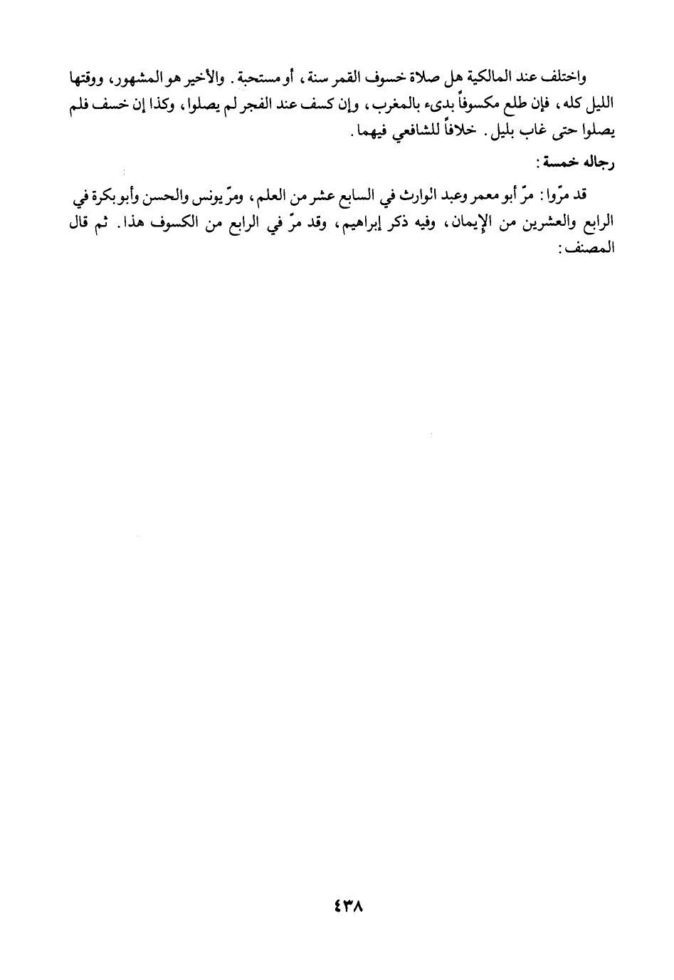واختلف عند المالكية هل صلاة خسوف القمر سنة، أو مستحبة. والأخير هو المشهور، ووقتها الليل كله، فإن طلع مكسوفًا بدىء بالمغرب، وإن كسف عند الفجر لم يصلوا، وكذا إن خسف فلم يصلوا حتى غاب بليل. خلافًا للشافعي فيهما.