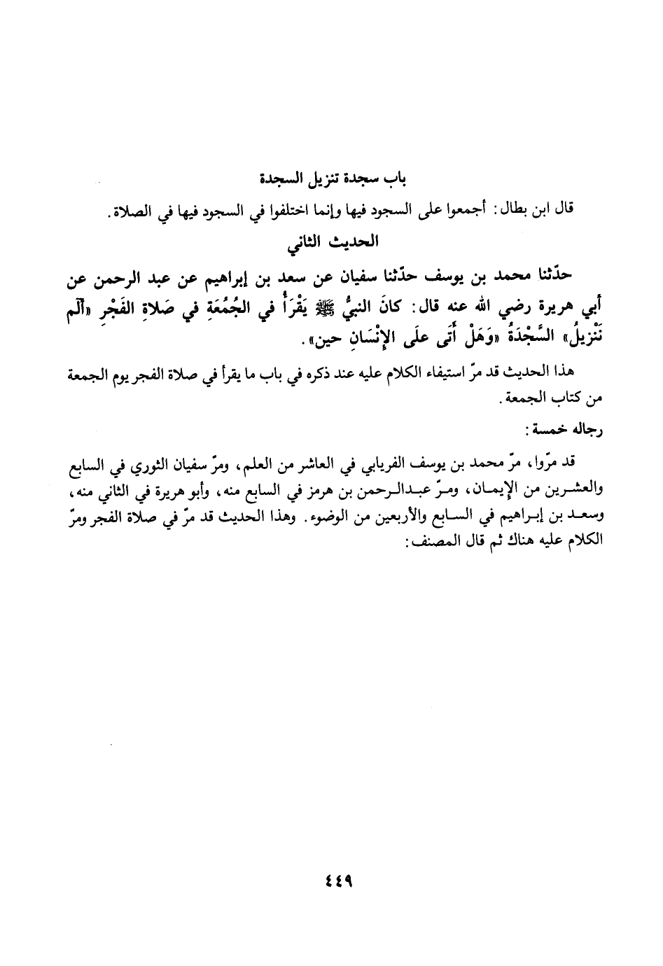 حَدَّثَنَا مُحَمَّدُ بْنُ يُوسُفَ حَدَّثَنَا سُفْيَانُ عَنْ سَعْدِ بْنِ إِبْرَاهِيمَ عَنْ عَبْدِ الرَّحْمَنِ عَنْ أَبِي هُرَيْرَةَ رضي الله عنه قَالَ: كَانَ النَّبِيُّ -صلى الله عليه وسلم- يَقْرَأُ فِي الْجُمُعَةِ فِي صَلاَةِ الْفَجْرِ {الم (1) تَنْزِيلُ} السَّجْدَةَ وَ {هَلْ أَتَى عَلَى الْإِنْسَانِ حِينٌ}.